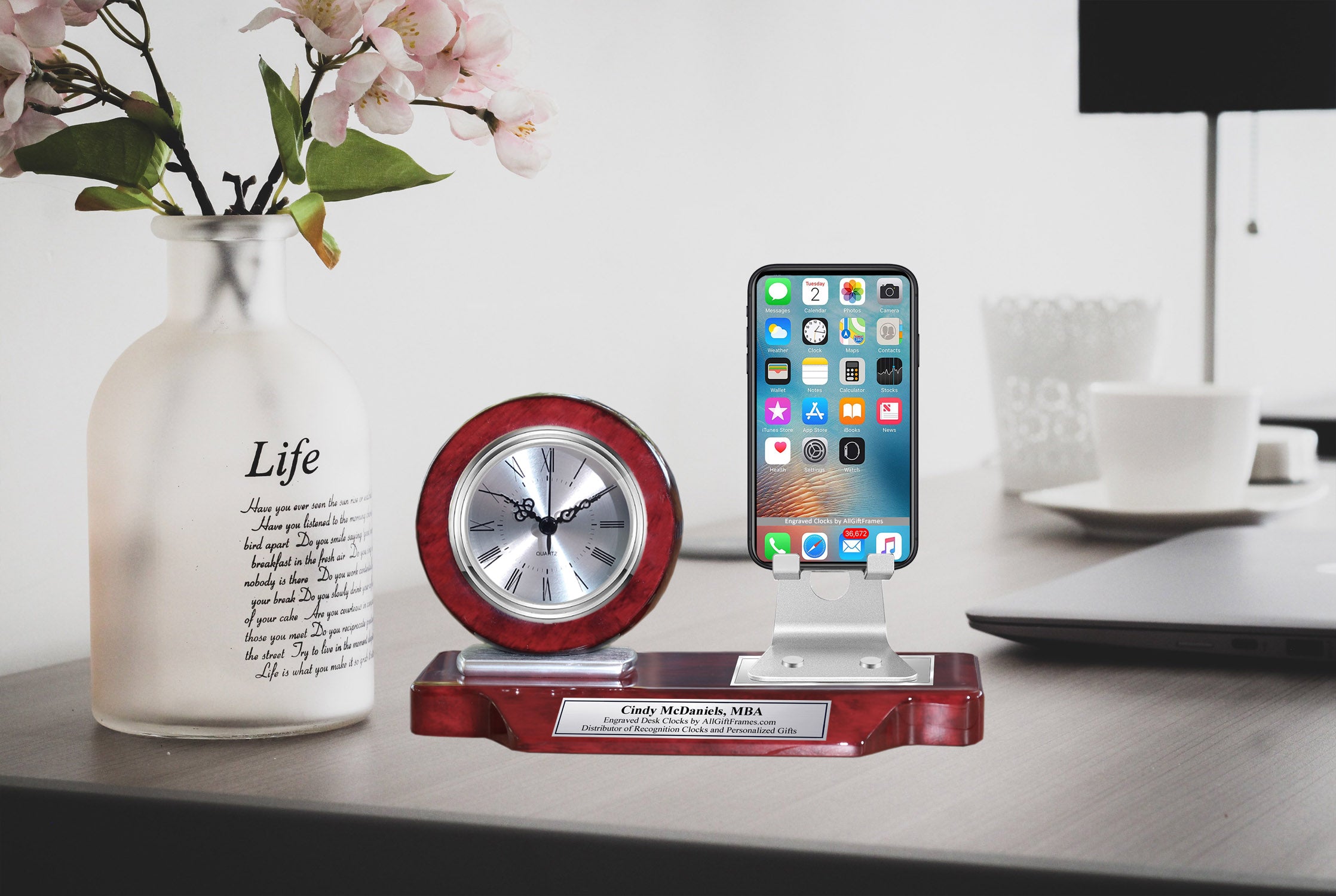 Let our custom name plate desk clock and smart phone display holder stand accessories corporate personalized etched clocks and personalized company employee promotion business products imagination wander and explore the possibilities that you can create with AllGiftFrames recognition awards and trophies. Rating high on style and elegance, Framing Achievement's corporate engraved clocks and personalized graduation tabletop appreciation gifts are the first choice in premium employee appreciation service gifts. Custom Business Card Holder Engraved Executive Name Plate Display Combo Wood Desk Etched Silver Clock Personalized Gift Graduation Graduate Employee Promotion. Cell phone stand is suitable for all 4-8 inch smart phones such as iPhone, Samsung phones, Google Nexus etc.. Metal Phone stand rotation angle so you can adjust your smartphone to the best angle. The depth thickness of the phone holder is .80 inches so it will fit a phone that has less than .80" inch thickness