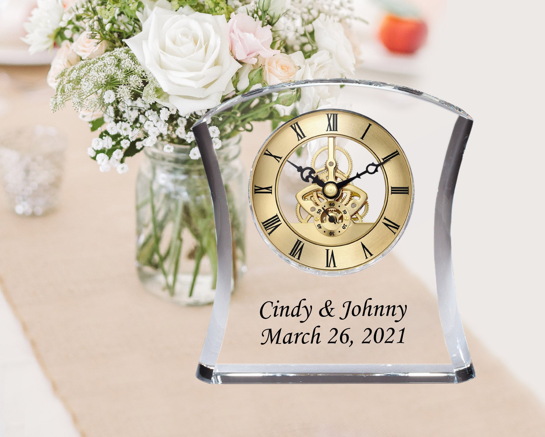 ♥ Personalized Sleek Curve Crystal Table Shelf Clock with Gold DaVinci Moving Gear Dial