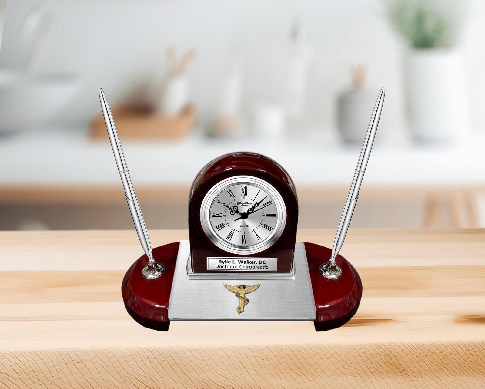 Smartly contrasting brush metal base ridges paired with polished cherry wood accents accentuate the stunning clock with ornamental hour and minute time needle and deluxe quartz movement. As unique, made of solid wood and beautiful silver aluminum, this personalize engraved desk clock magnificently hold two metal pens with a dual tone gold metal doctor of chiropractic logo for chiropractor. Breathtaking retirement award dual pen nameplate plaque desk clock gift is of an unparalleled design. Custom engraved table clock with silver engraving plaque and a personal message or retirement wishes to the medical profession symbolizes the importance of appreciation and recognition.