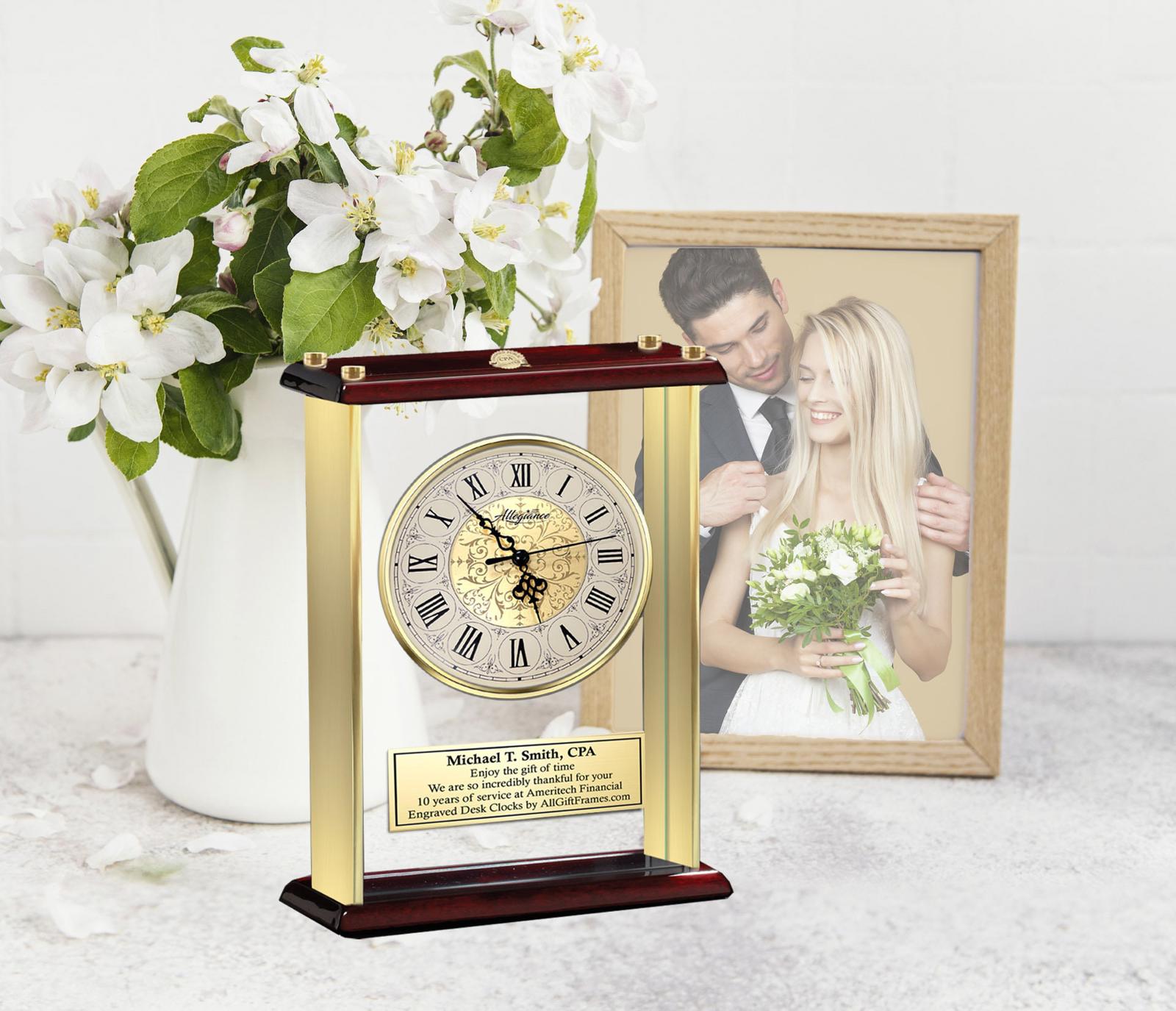 ♥ Personalized elegant tabletop mantel brass gold metal clock, polished cherry wood finish, elegant roman numerals with metal gold finish column and rosewood top and base. An attractive framework timepiece with deluxe quartz movement.