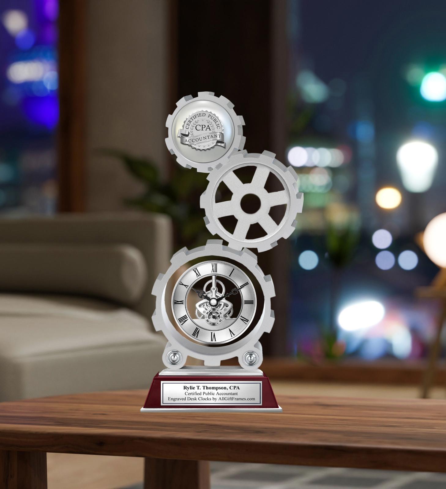 Towering different size engineering gear shape layers provides a spacious platform for creative personalized congratulation message etchings perfectly suited to congratulate coworker accountant, boss enrolled agent or colleague years of service, student graduate appreciation or accountant retirement. A personalized table desk clock award that is truly a work of art sculpted in solid aluminum and wood. Personalized engrave clocks are the best accounting school graduation gift that is functional, beautiful and stunning.