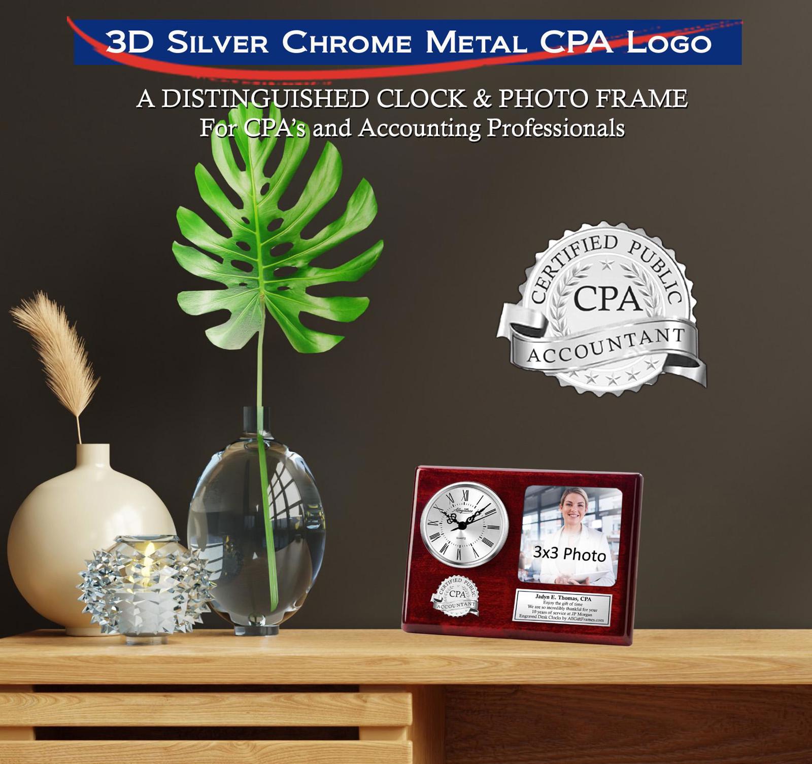 Proudly display a message of congratulation or personalization on a silver engraved plaque. Personalized award trophy plaque engraved desk clock in wood cherry casing with logo. An etched nameplate display plaque for Certified public accountant recognition appreciation or retirement gift to your CPA coworker boss colleague friend or boss. Wood panel table plaque holds a 3x3 picture and a custom personalized nameplate display message with 3D chrome silver CPA emblem. Crafted from a blend of cherry wood, this Certified public accountant recognition appreciation retirement gift clock timepiece is perfect for any accountant home or accounting office.
