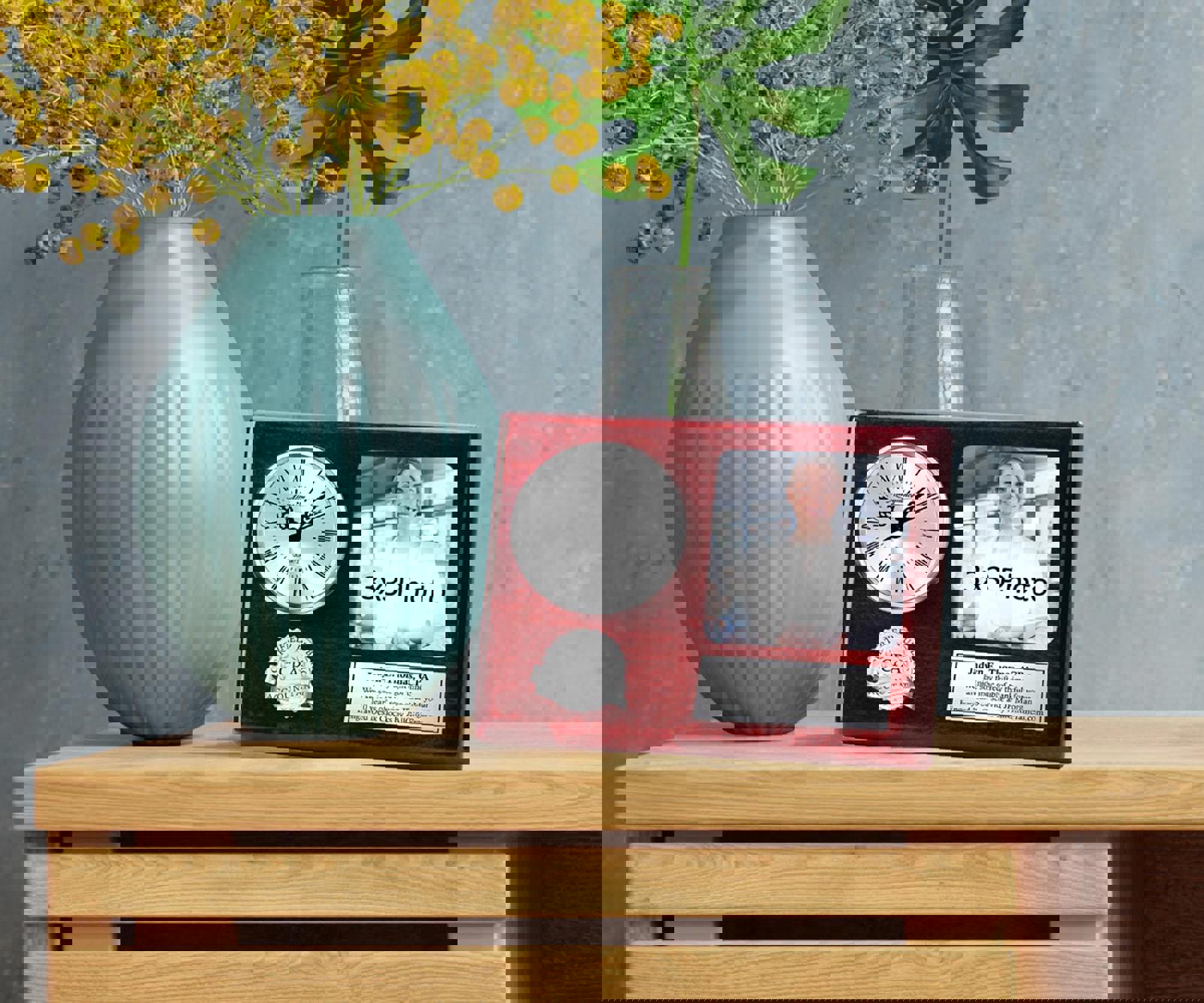 ♥ Personalized cherry wood picture frame and silver engraved plaque desk clock with deluxe quartz movement