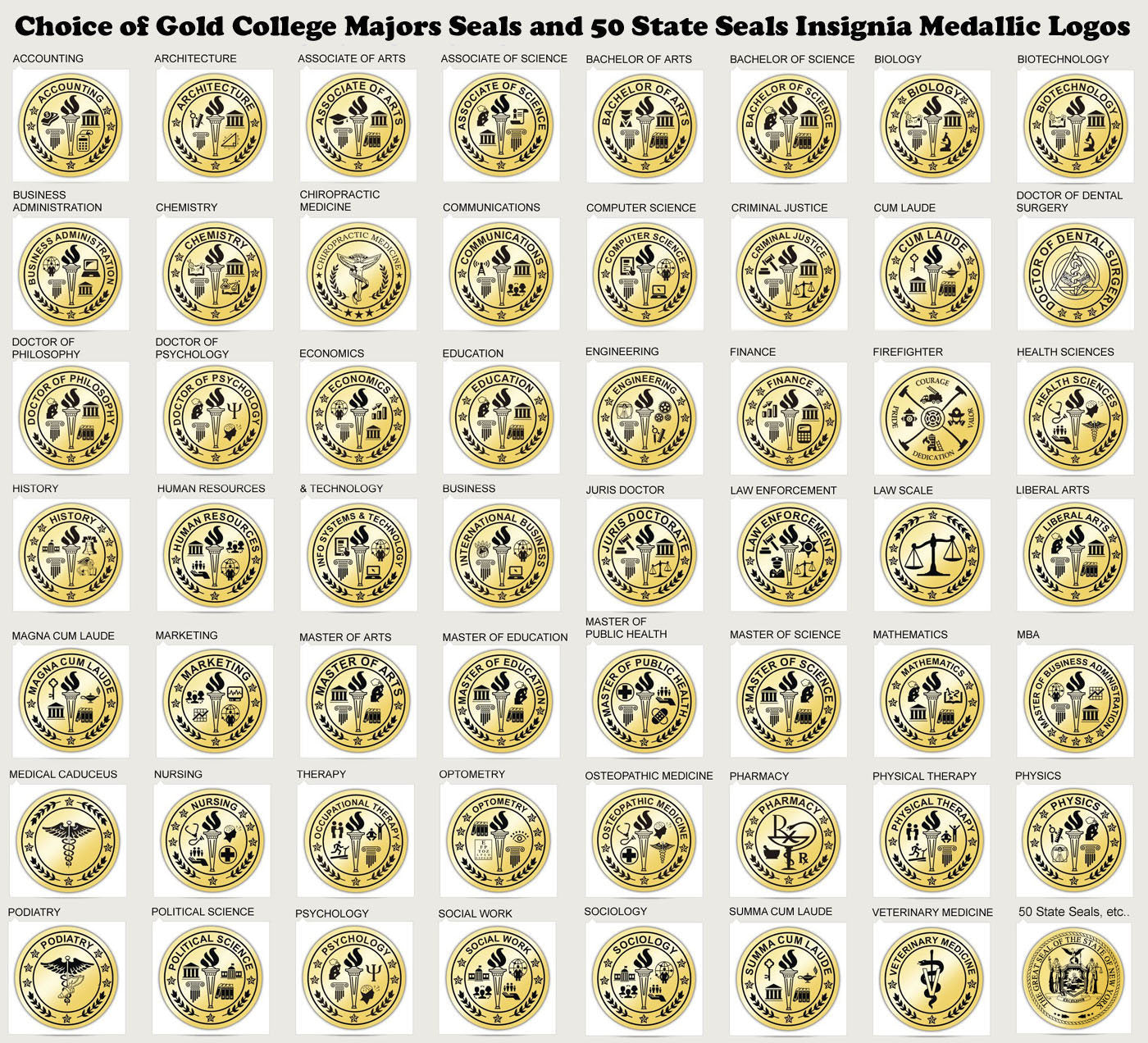 Accounting, Architecture, Associate of Arts, Associate of Science, Bachelor of Arts, Bachelor of Science, Biology, Biotechnology, Business Administration, Chemistry, Chiropractic Medicine, Communications, Computer Science, Criminal Justice, Cum Laude, Doctor of Dental Surgery DDS, Doctor of Dental Medicine DMD, Doctor of Optometry OD, Doctor of Education, Doctor of Medicine MD, Doctor of Pharmacy Pharm D., Doctor of Philosophy PHD, Doctor of Psychology PsyD, Economics Education, Engineering, Finance, Firefighter, Health Sciences, History, Human Resources, Info System & Technology, International Business Juris Doctor, Law Enforcement, Law Scale, Liberal Arts, Magna Cum Laude Marketing, Master of Arts, Master of Education, Master of Public Health Master of Science, Mathematics, MBA, Medical, Nursing, Nurse Practitioner, Occupational Therapy, Optometry, Osteopathic Medicine DO, Pharmacy, Physical Therapy, Physics Podiatry, Political Science, Psychology, Registered Nurse, Social Work, Sociology Summa Cum Laude, Veterinary Medicine