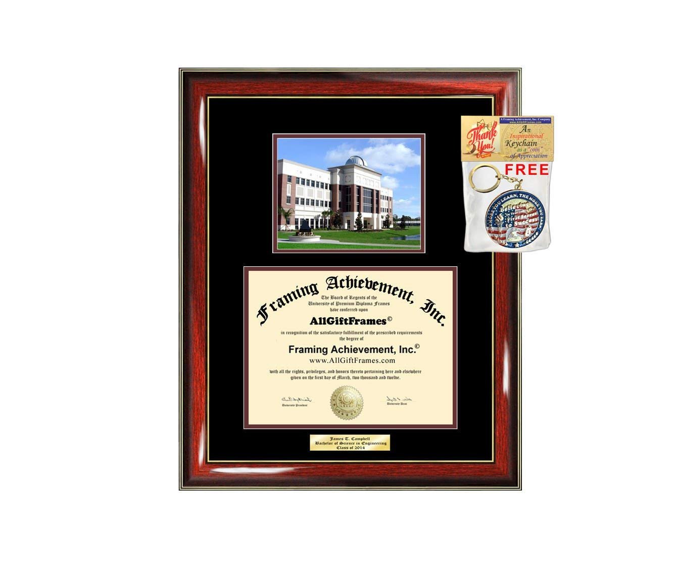 Customized engraved quality large Florida Institute of Technology degree frames and certificate frames with school fisheye picture using state-of-the-art quality control techniques to display achievement. Selling a variety of deluxe wood custom college university FIT diploma frames with campus photo image. All certificate frames are custom made to fit your diploma document sizes. University diploma frame campus school photo with school image picture college picture image as a graduation gift that showcase a beautiful unique degree or certificate degree plaque. These graduation custom diploma frames can display professional certifications and degrees with a campus image. This diploma frame holder case features a beautiful Engraved Document Plaque Glossy Prestige Mahogany with Gold Accents wood moulding and school photo. This eye-catching stunning Florida Institute of Technology diploma frame makes it a unique graduation gift idea for law school, college, university, engineering, medical school, dental school, nursing graduates etc.. After you place your order, email us through AchievementGifts (Amazon) or AllGiftFrames and let us know your "diploma size," Includes Double-matting Top mat (Black) Inner matted (Gold), backboard, pH balance matboards help preserve and protect your diploma, glass and hanging hardware. All certificate college frames are custom made to fit your diploma sizes. Vast selection of college degree FIT frames to fit a bachelor, masters, mba, doctorate, juris doctor, phd, nursing etc.. degrees at cheap prices.