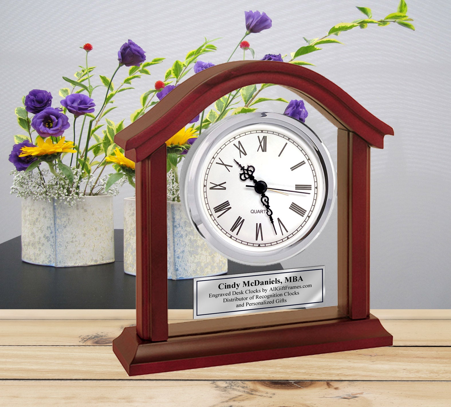 A handsome decoration for any office or home setting. It makes an excellent birthday, housewarming, new home, real estate agent, anniversary, retirement, wedding and employee service award gift. Overall clock size 6 x 7 Engraved Astor Arch Wood Desk Gold Clock with Glass Personalized Etched Retirement Gift Service Award Employee Recognition Graduation Birthday Thank You Present.