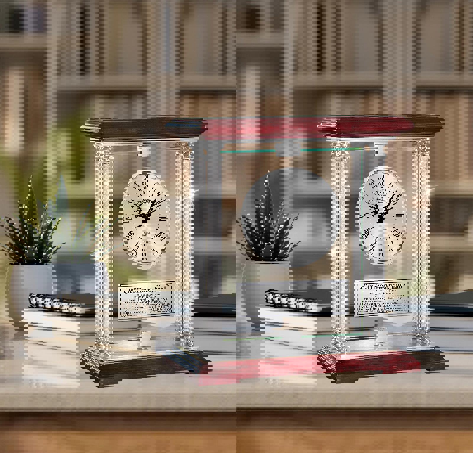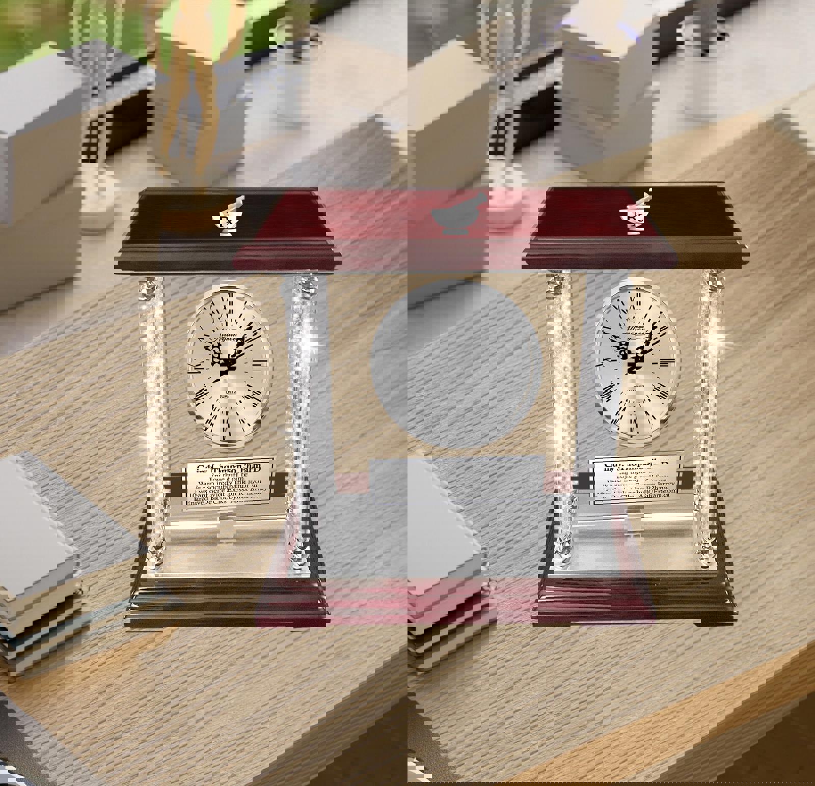 Breathtaking beautiful congratulation clock pharmacy employee service awards are created with a personalized engraved thank you appreciation recognition plaque with glistening cherry wood top and base for pharmacist and pharmaceutical industry.