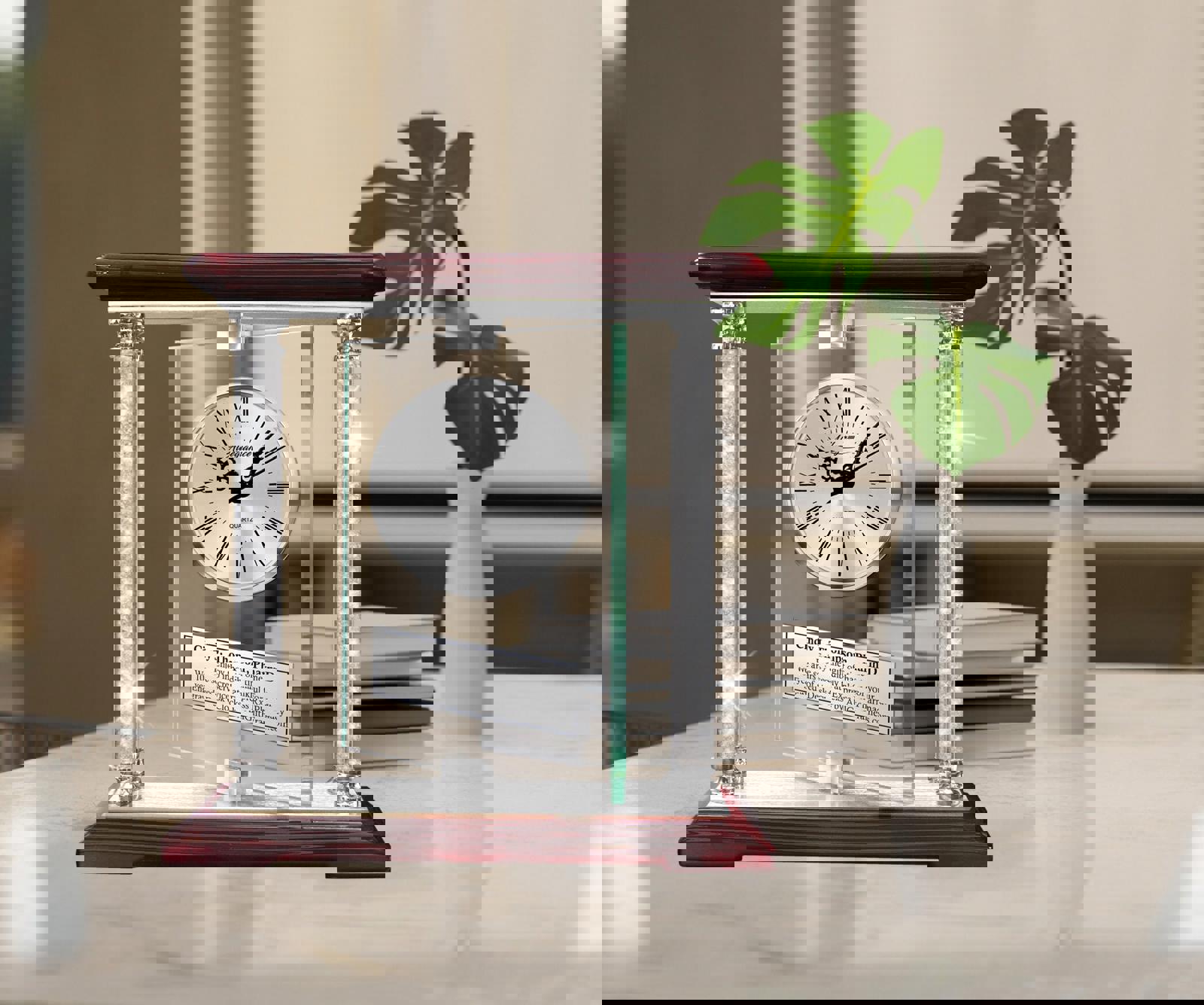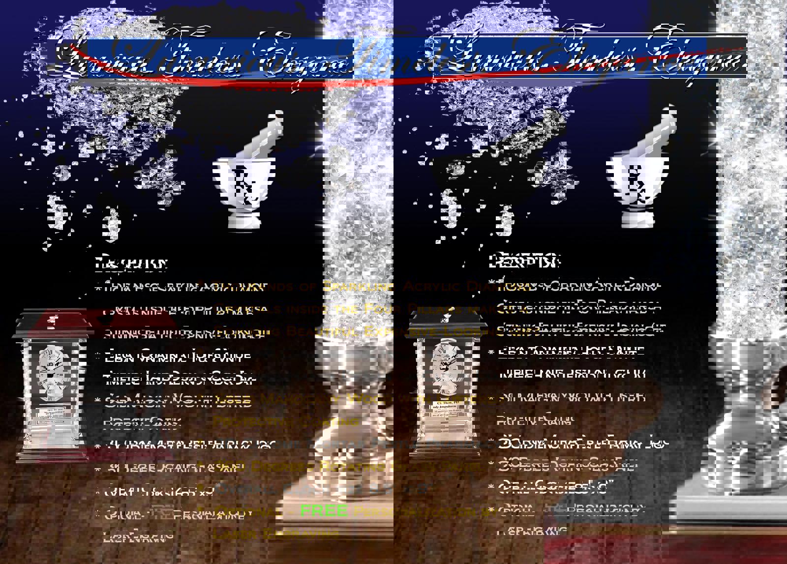 A silver dial personalized engrave plaque clock is expertly mounted in the beveled glass panel with a 3D chrome silver mortar pestle Rx pharmacy and placed at an imaginative angle on this uniquely admired retirement recognition congratulation promotion award. Embrace the stunning diamond engrave table accent clock as contemporary style luxurious gift for pharmacist and pharmacy coworker pharmaceutical professionals. The freestanding pristine clear crystal clock highlights this charming and elegant timepiece. Personalized silver engraving plaque gets your message out in a notable manner to showcase congratulation to the coworker recipient. Extraordinary in appreciation & unstinting in luxury, this four diamond filled column etch table clock is created with beauty on a grand scale. A college of pharmacy school graduation, employee promotion or simply a birthday gift of incomparable grandeur & palatial elegance.