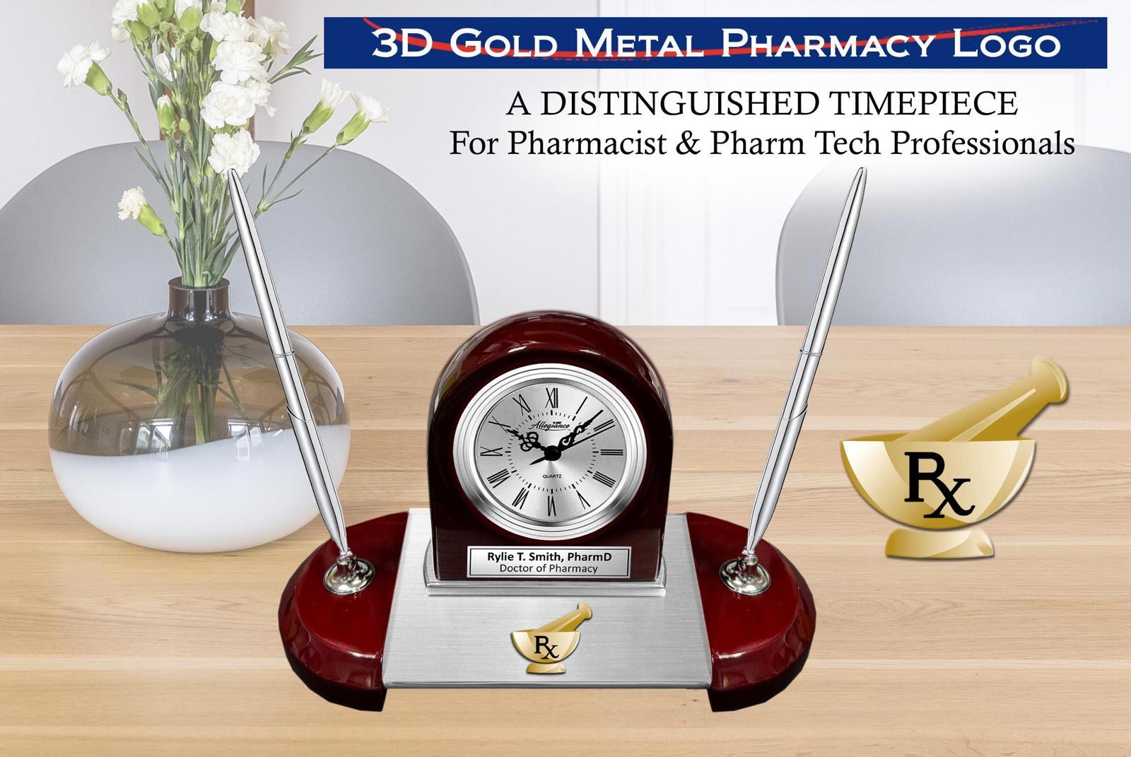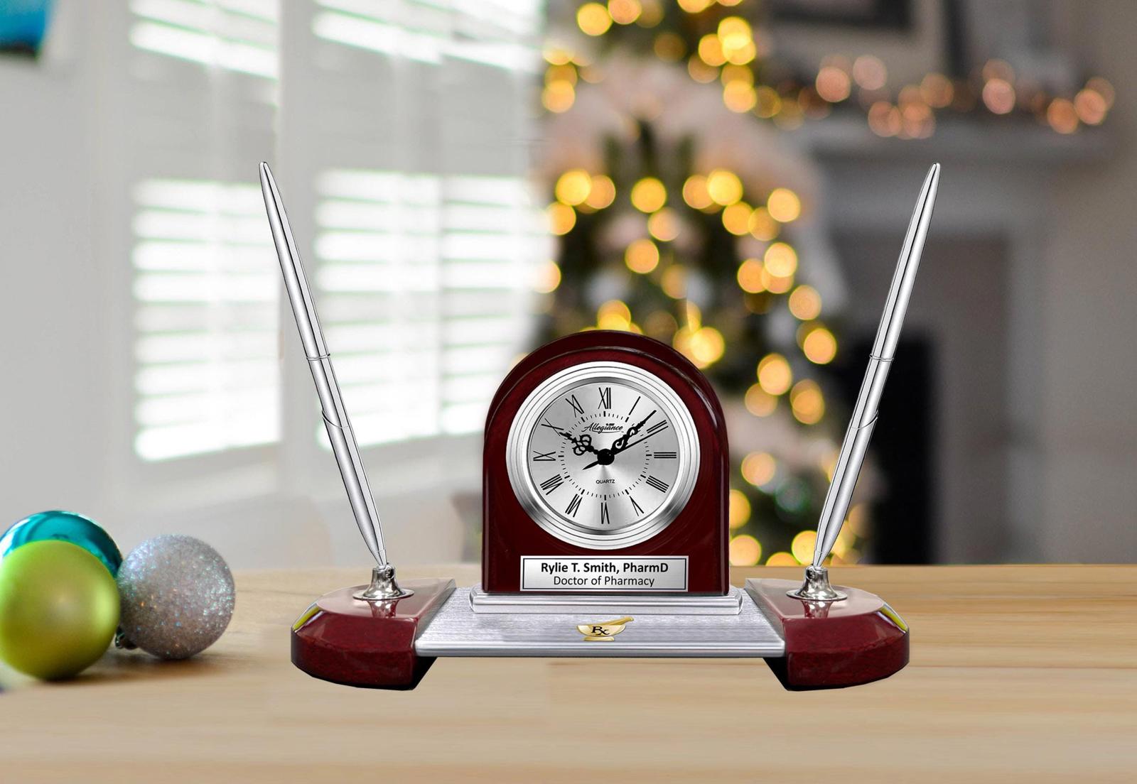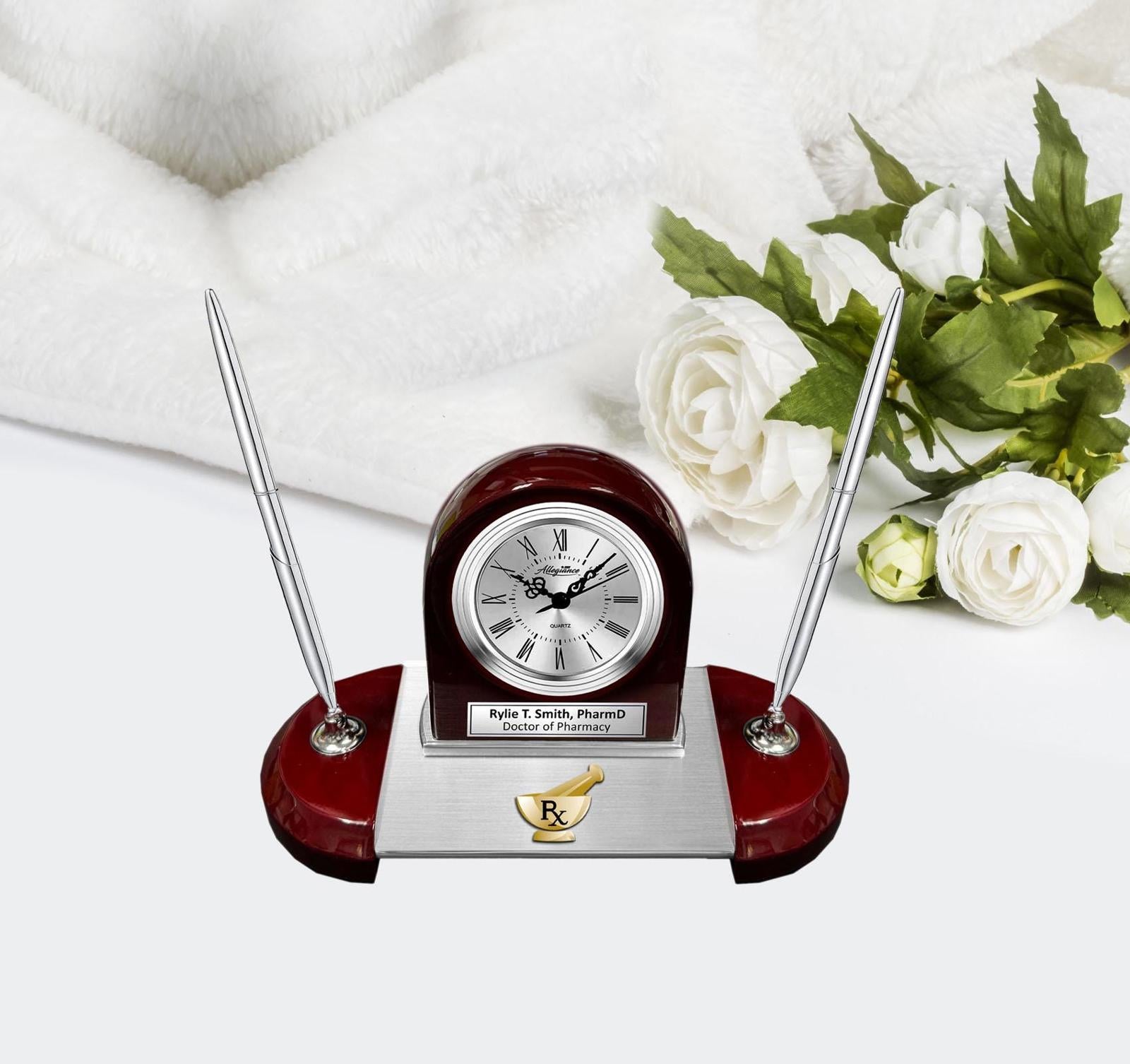 Custom engraved table clock with silver engraving plaque and a personal message or retirement wishes to the mortar pestle Rx symbolizes the importance of appreciation and recognition.