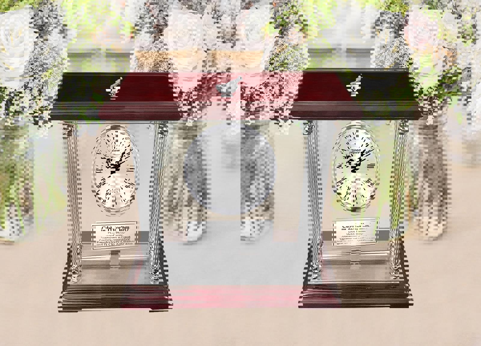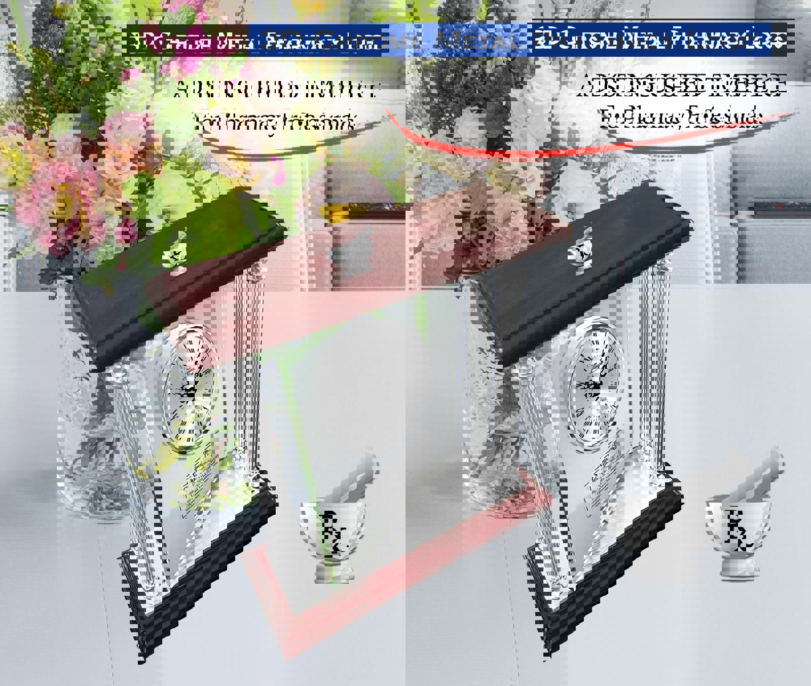The silver engraved desk glass aluminum metal mantel clock features a 360 degree manual rotating glass panel mounted with a silver clock on cherry wooden base that is surrounded by 4 silver metal aluminum columns. The point of giving a recognition, service award, PharmD retirement, Pharm D appreciation, pharmacy school graduation or thank you gifts is to enhance and recognized achievement with colleague, boss, coworker, pharmacist, Pharm tech and pharmacy professionals. Embrace the exquisite custom craftsmanship & timeless appeal of this dramatic sought-after desktop table etched silver glass clock.