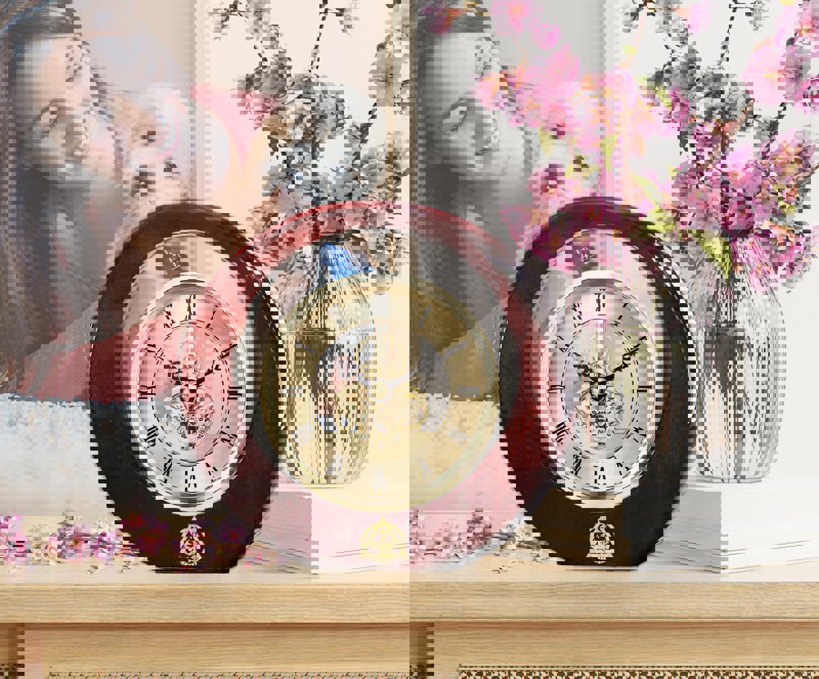 ♥ Luxurious Marquee tabletop mantel carved ridges hemispherical shape rosewood mantel table clock design with gold engrave plaque and brush gold personalized text message.