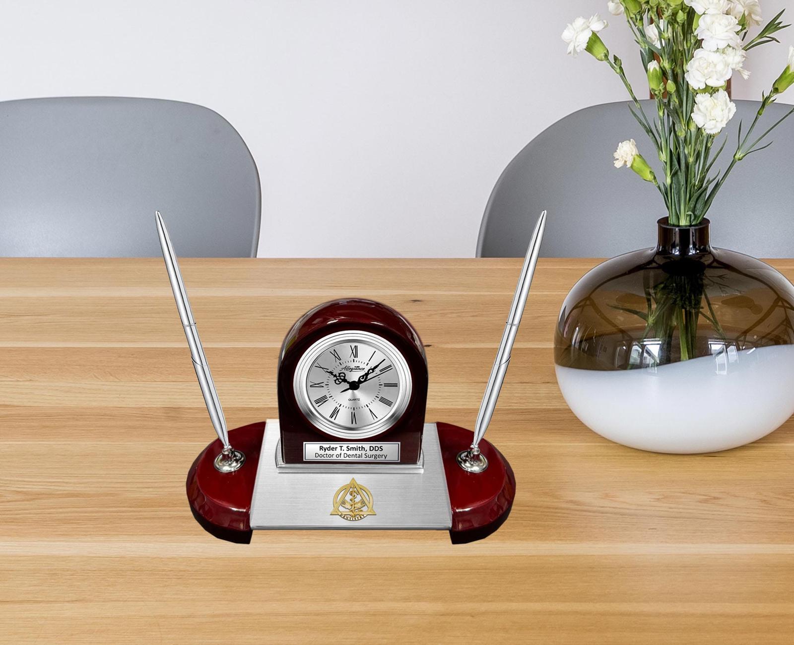 Custom engraved table clock with silver engraving plaque and a personal message or retirement wishes to the dentist symbolizes the importance of appreciation and recognition. Breathtaking dentist retirement award dual pen nameplate plaque desk clock dentistry gift is of an unparalleled design. As unique, made of solid wood and beautiful silver aluminum, this personalize engraved desk clock magnificently hold two metal pens with a dual tone gold metal dentistry logo for Doctor of Dental Medicine. The craftsmanship of the cherry wood arch clock casing rising from the silver metal base is elegant, affording a most desirable dentist congratulation retirement award, employee service award, dental school graduation gift.