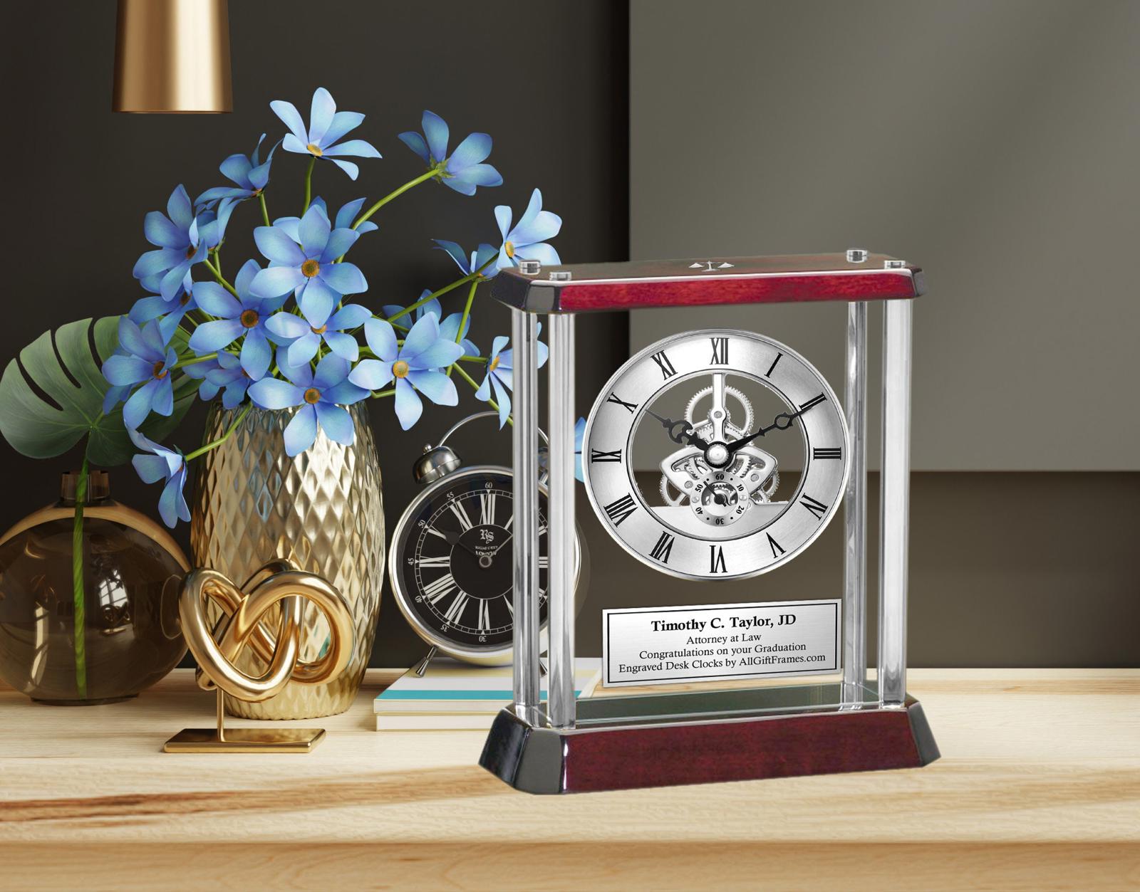 Our featured beautiful shelf mantel clock are not just an addition to a recognition trophy collection, they are the heartstrings that tie the achievement and appreciation in a service award, passing the bar or law student graduation gift. Coworker years of service award and attorney appreciation is elevated to a new level with this table desk mantel clock timepiece for office or home. The tall, heavy and aluminum accent gear design clock, beautifully etched, further enhances this sleek congratulation or thank you lawyer, judge or student graduation gift. At the pinnacle of life’s milestone moments such as birthday, graduation, romance, the personalized silver clock is the culmination of what a gift should be. Functional and attractive define the engraved clock that proudly presents etched words of congratulation, achievement and appreciation.