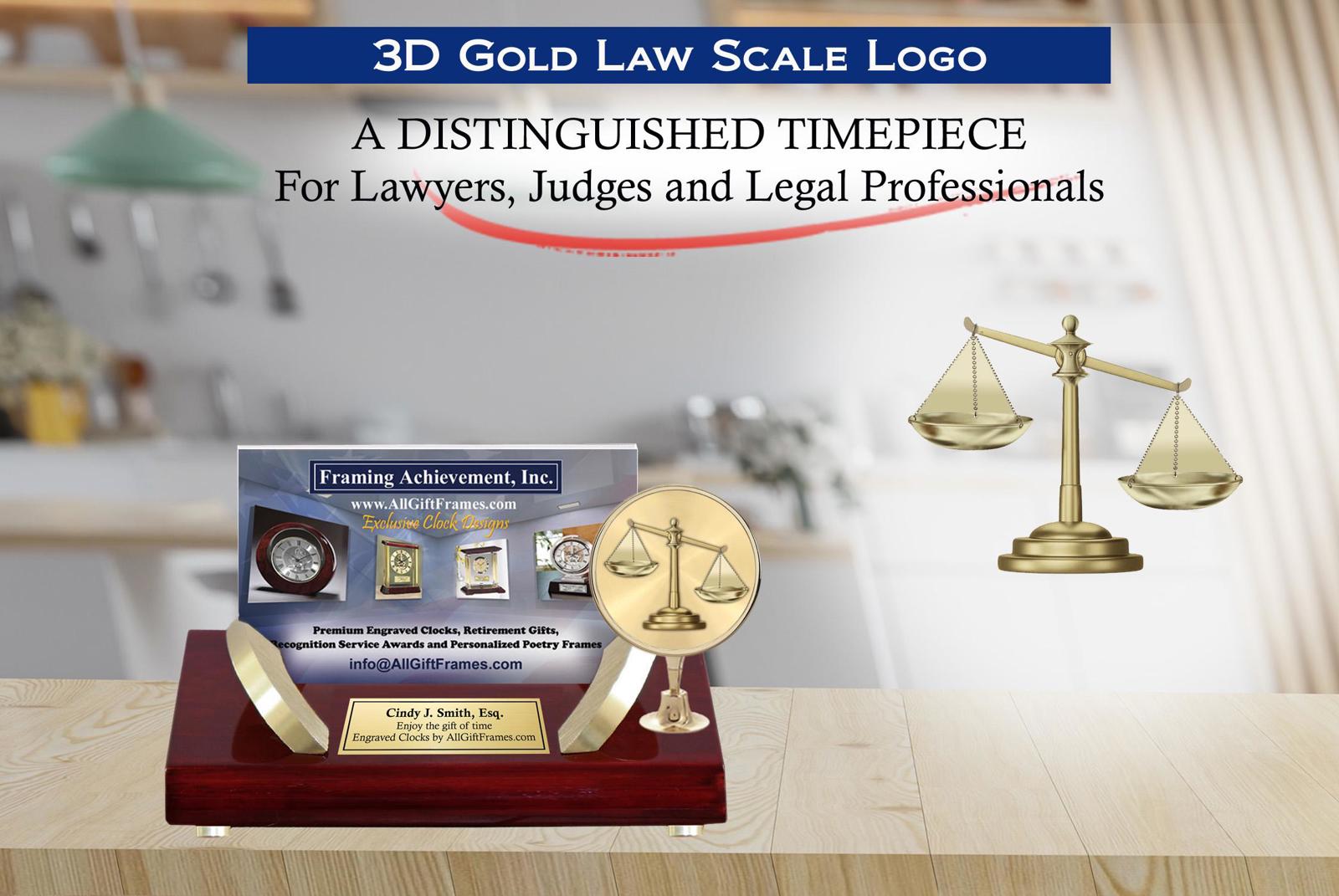 Personalized engraved gold accents business card holder nameplate with law scale logo as employee recognition, promotion or coworker service award and passing state bar gift. Inspired by employee congratulations and recognition, layers of protective glossy coating are applied to create the perfect attorney retirement award.