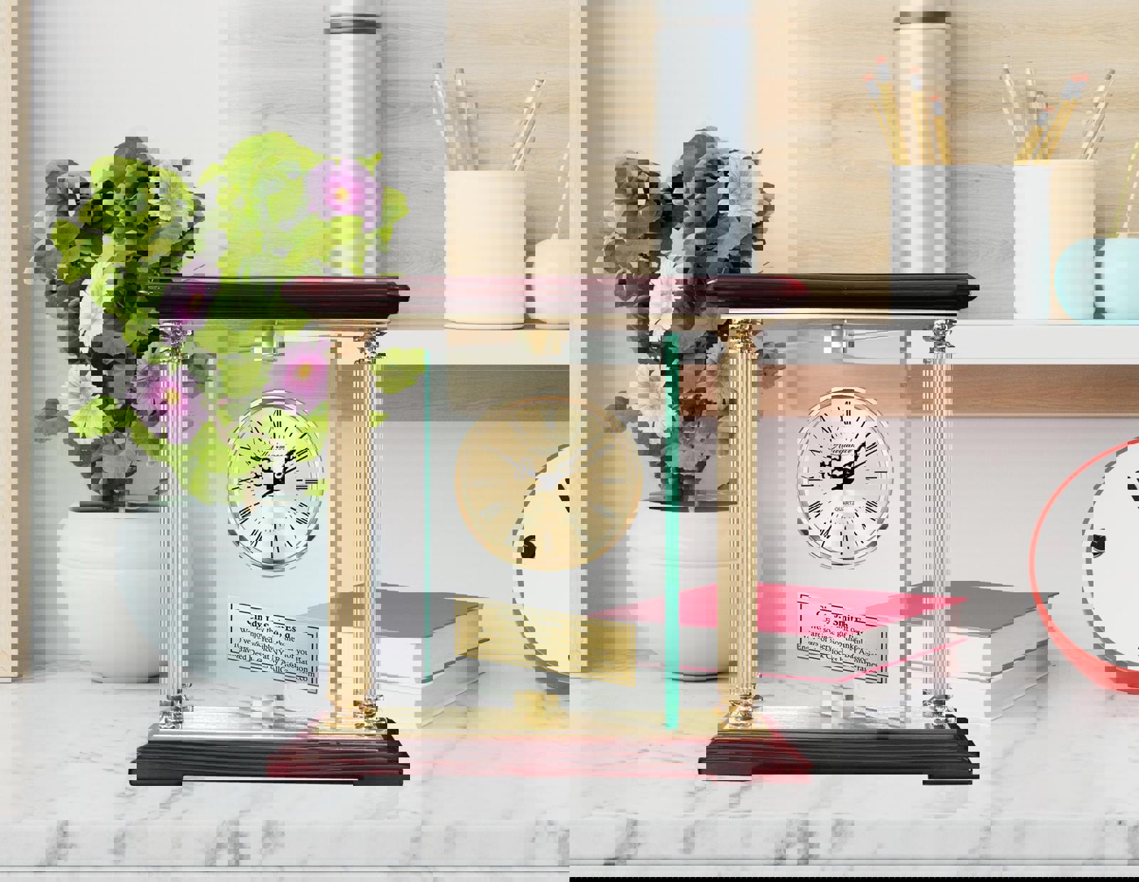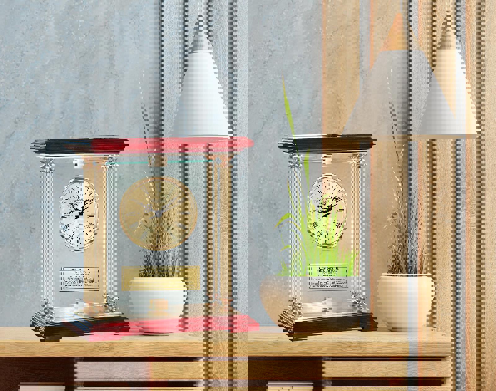 ♥ Premium Laser Engraved Quartz Movement Clock Embedded in Manual Swiveling 360 Degree Glass. Four Metal Gold Pillars with Engraving Plaque on Shiny Cherry Wood Top and Base