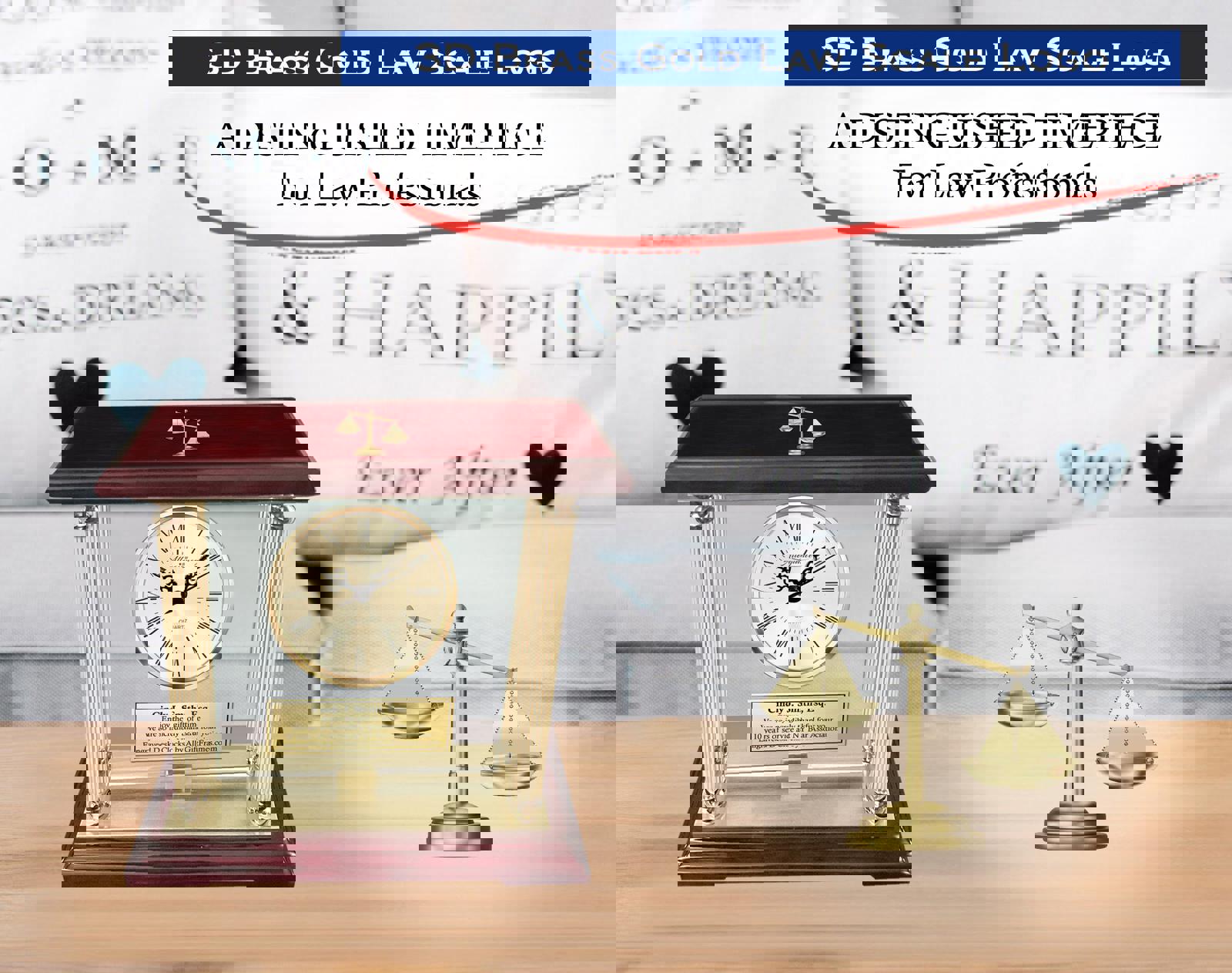 The Juris Doctorate Esquire engraved tabletop mantel clock built to recognized the attorney, lawyer, judge, paralegal or legal professional. This 3D law scale logo emblem etched personalized plaque award clock is a unique luxury timepiece with etched plaque display.