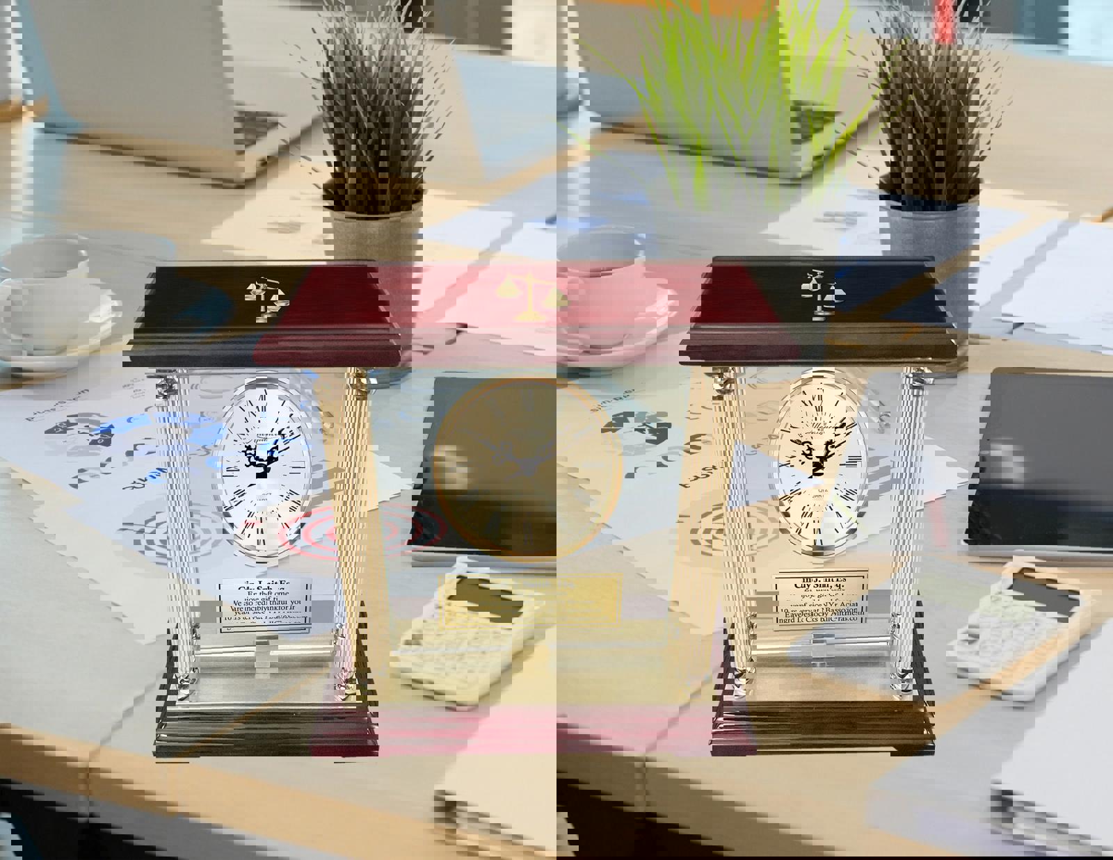 An 3D law scale logo emblem personalized clock for attorney, judge, lawyer, paralegal or legal professional that raises the bar in quality, functional and unique retirement, service award, thank you, passing state bar and law school graduation gift. The Juris Doctor gold engraved desk glass mantel clock features a 360 degree manual moving glass panel mounted with a gold clock on cherry wooden base that is surrounded by four brass metal columns. The point of giving a recognition, years of service award, retirement, congratulation, appreciation, law school graduation or thank you gifts is to enhance and recognized achievement with colleague, boss, coworker, attorney, lawyer, paralegal, judge and legal professionals. Embrace the exquisite custom craftsmanship & timeless appeal of this dramatic sought-after desktop table etched silver glass clock. With its top and bottom polished cherry wood top base, along with a gold engraving plaque, will let your words of congratulations shine bright in a manner to inspire all.