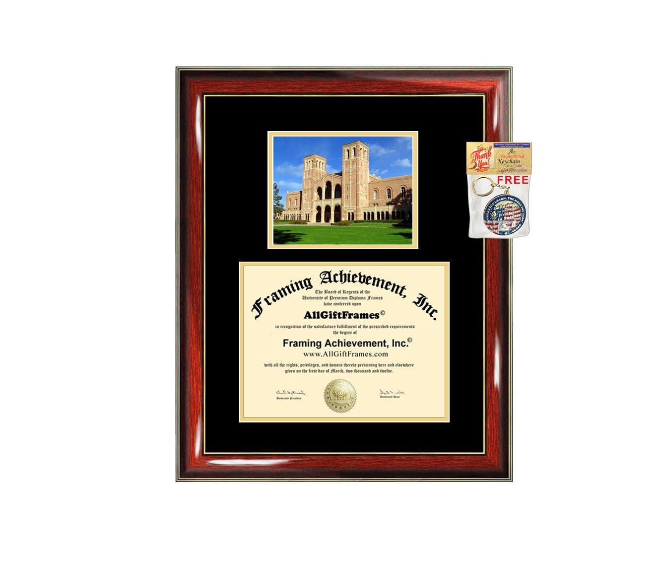 Browse through our hundreds of university campus diploma frame store and you will find a selection of college degree frames at great prices. From college major logo medallions to gold embossing on the mat of the plaque, our graduation college UCLA diploma frames are unique gifts for University of California Los Angeles university graduates. We appropriately capture & display your honors degree and university diploma with its memorable beauty. Commemorate a University of California Los Angeles, UCLA college or high school graduate with their academic success with a personalized diploma frame with gold embossing, college major or state seal logos and engraving plate.