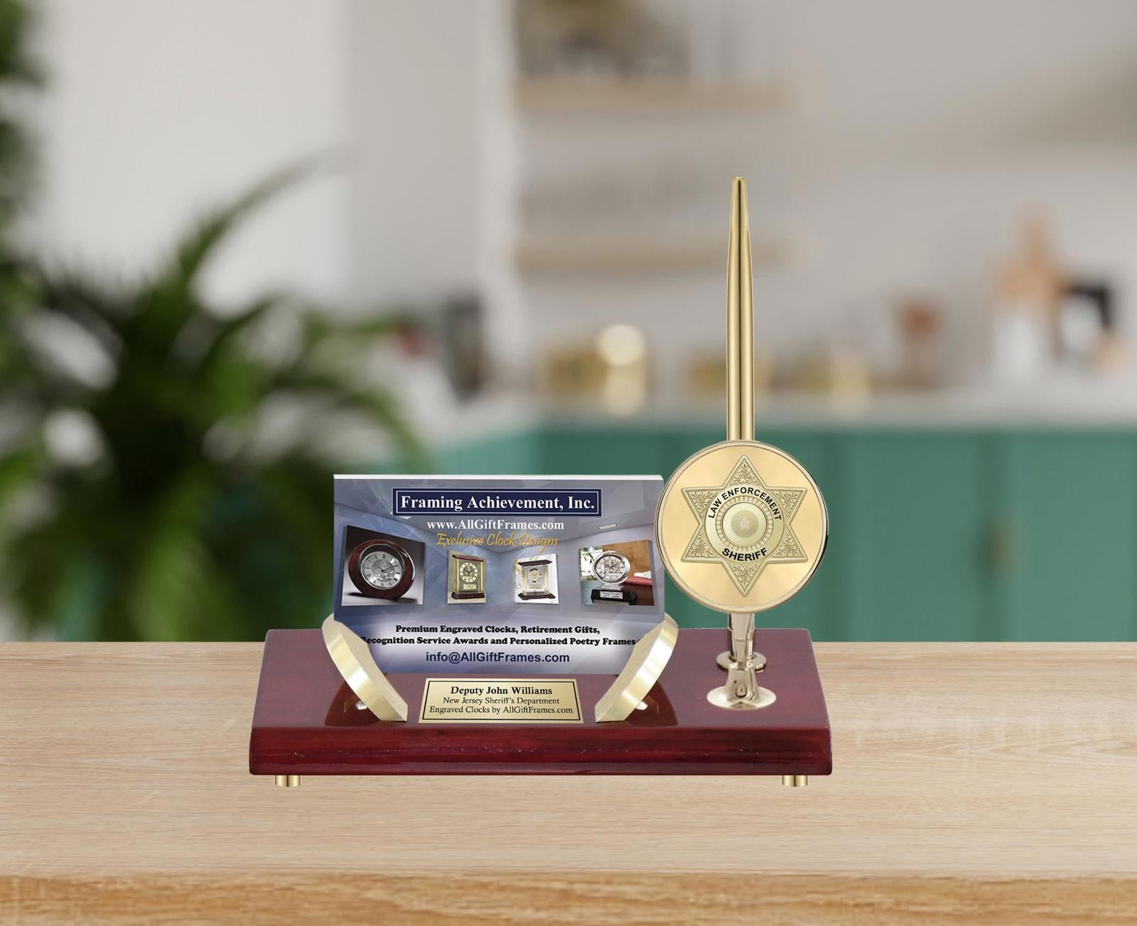 Gold engraved plaque business card holder couple with a gold pen create a sophisticated allure worthy sheriff graduation gift. Display the professional detective deputy sheriff graduate title and display professional business cards on the elegant gold metal accent holder with 3D gold metal sheriff star logo.