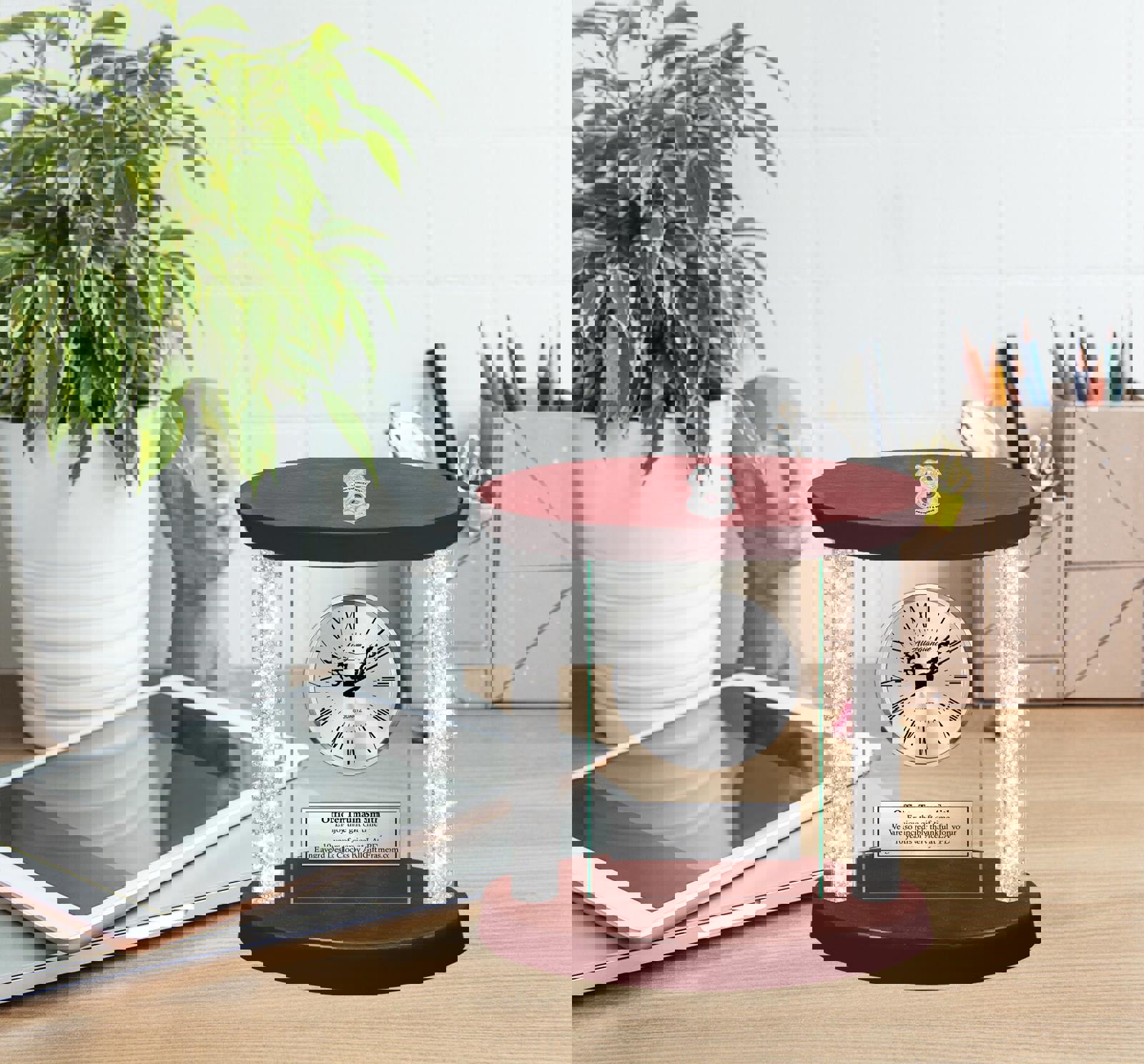 Journey through time and space, encapsulated in the most luxurious combination of materials and designs with this beautiful etched table top double crystal diamond column desk clock with 3D silver law enforcement logo. Crafted by skilled clock artisans, mottled hues of colorant cherry wood finishes and silver engraving plaque are applied to achieve a time-endured elegance, adding recognition sophistication to any probation or correctional police officer or police academy graduate. A stunning and alluring personalized dual acrylic crystal diamond filled pillar law enforcement logo award desk clock. This exquisitely crafted police officer retirement, police academy graduation gift, sheriff deputy birthday present or state trooper years of service award curates a unique design clock that convey modern-day elegance for police department employees. We endeavor to offer an engraved table clock for the law enforcement profession which embodies beauty and perfection, with an undeniable modern edge of distinction for the new police academy graduation graduate gift. Embrace the exquisite custom craftsmanship & timeless appeal of this dramatic law enforcement retirement or end of watch congratulation service award clock gift with 3D silver chrome law enforcement logo and personalized silver plaque.