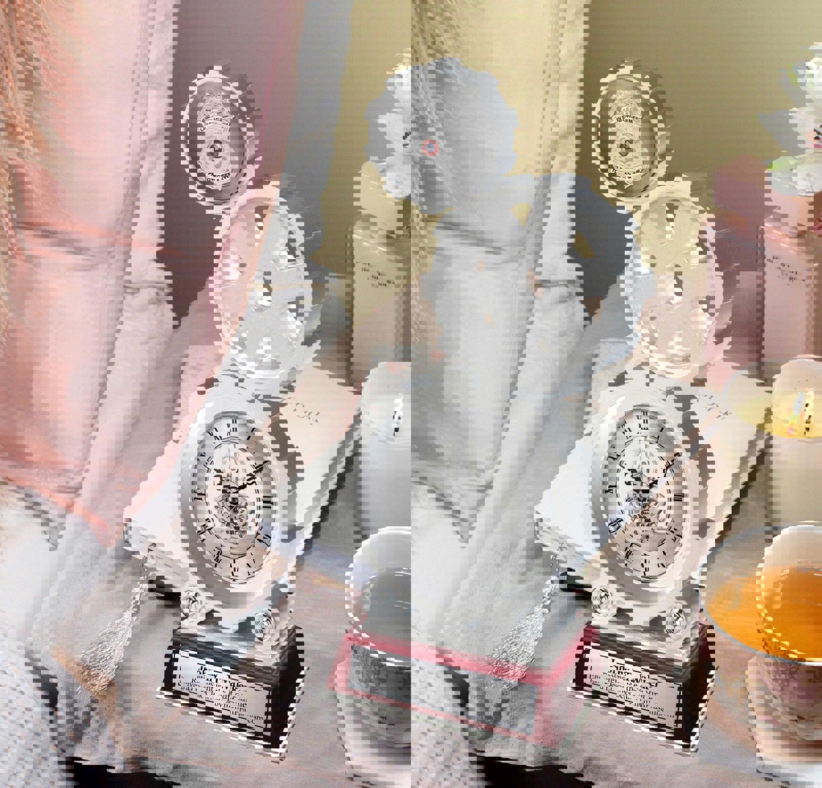 Triple towering gear shape design with its solid and heavy silver aluminum gear monument take the shape of a remarkable police academy graduation or law enforcement service award gift for state trooper, deputy sheriff, detective, probation or correctional officer. A truly stunning appreciation and rewarding engraved clock with law enforcement badge logo. Towering different size gear shape layers provides a spacious platform for creative personalized congratulation message etchings perfectly suited to recognize coworker officer, boss chief or deputy colleague. A personalized table desk clock award that is truly a work of art sculpted in solid aluminum and wood. Custom engrave clocks are the best police academy graduation gift that is functional, beautiful and stunning.