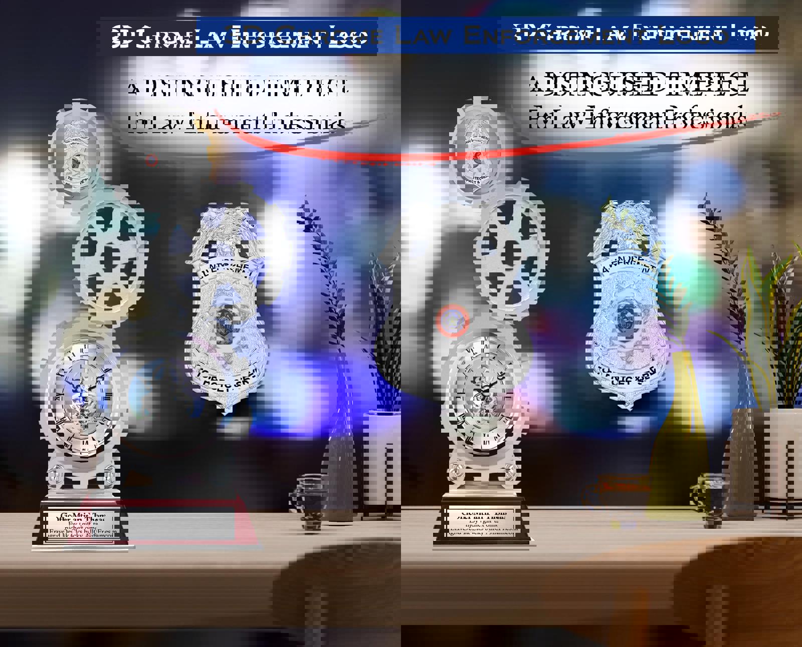 Coworker, boss or colleague employee congratulation award is elevated to a new level with this table desk clock timepiece with chrome silver 3D law enforcement shield logo for police officer department office or home decor. ********************************************