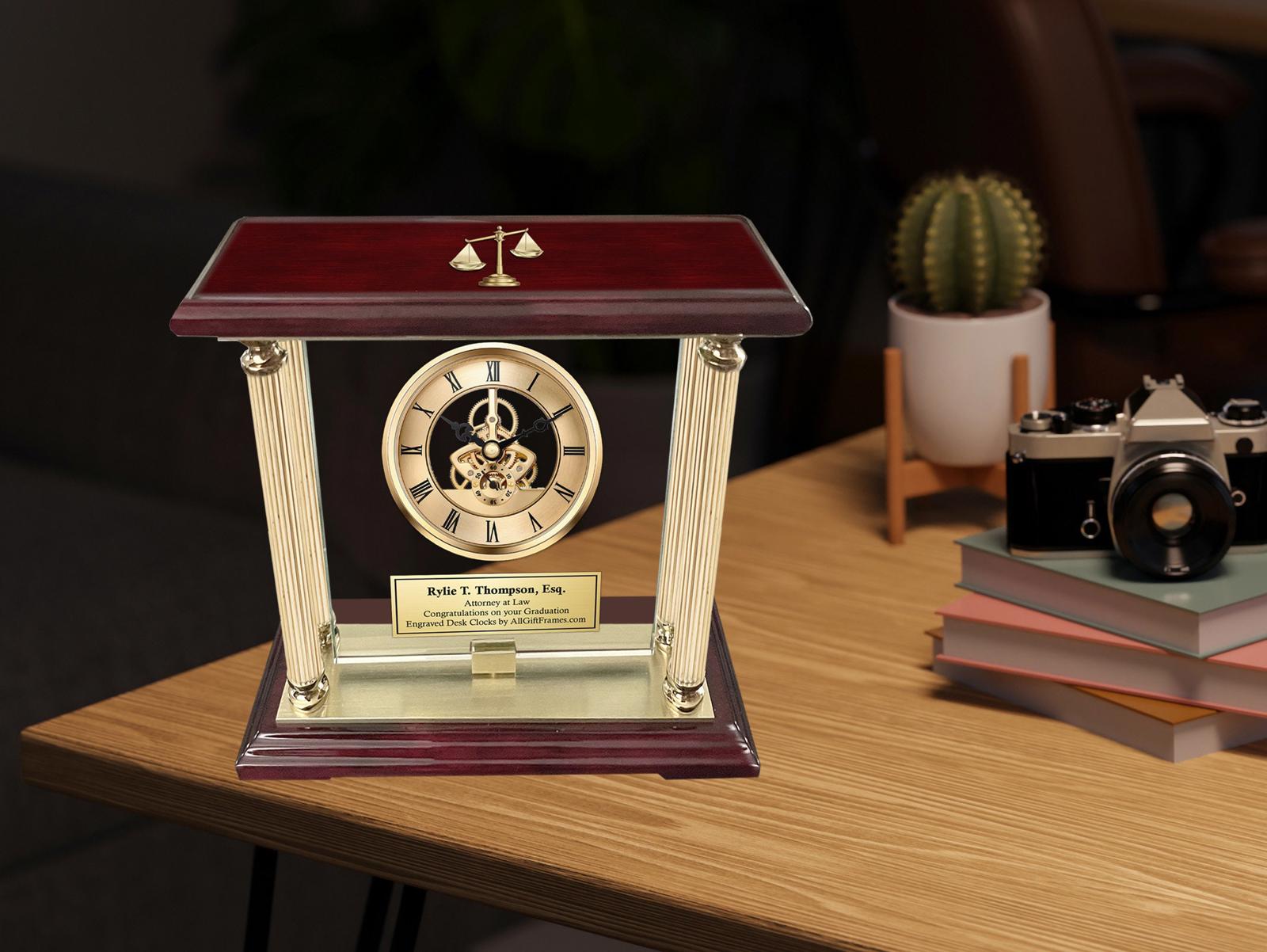 Breathtaking beautiful congratulation passing the bar clock awards are created with a personalized engraved thank you appreciation recognition plaque mounted on glistening crystal clear glass panel. Whether displayed in an law office or home, the encore adds elegance to any decor. The gold engraved plaque is skillfully crafted into piercing images setting a lofty theme. A gift of time for Juris Doctorate, judge, paralegal or Esquire recipient. The crisp, cool brilliance of gold metal brass pillars radiates from this stunning legal or law award engraved clock with brass gold law scale insignia that is a unique employee service award, retirement gift or law school graduation gift. Proudly engrave a special message of congratulations and gratitude in a truly unique, handsome manner to the attorney, judge, passing the bar and law school graduate student. This personalized engraved desk clock embodied the very essence of a quality law gift.