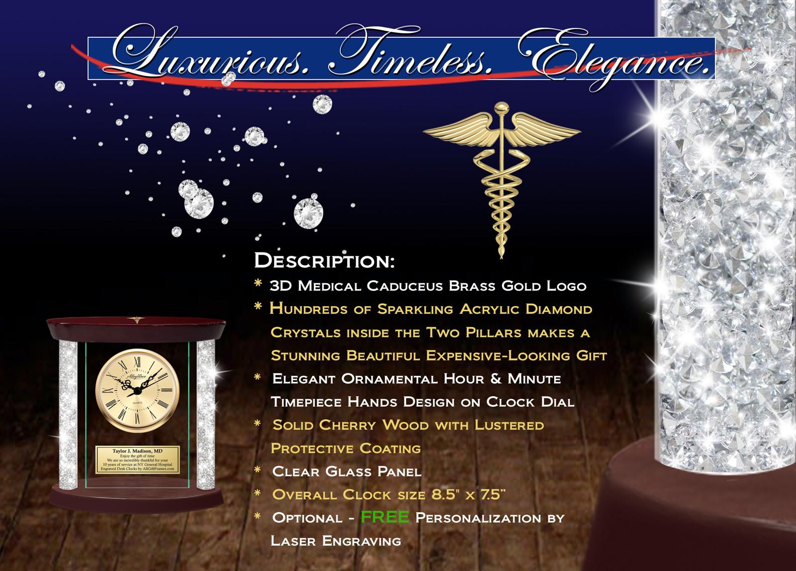 The double crystal diamond filled clock columns fuses traditional design with cutting edge style in a brilliant celebration of wood and glass. Embrace the exquisite custom craftsmanship & timeless appeal of this dramatic nursing school graduation retirement service congratulation award engraved clock gift present with 3D gold medical caduceus logo.