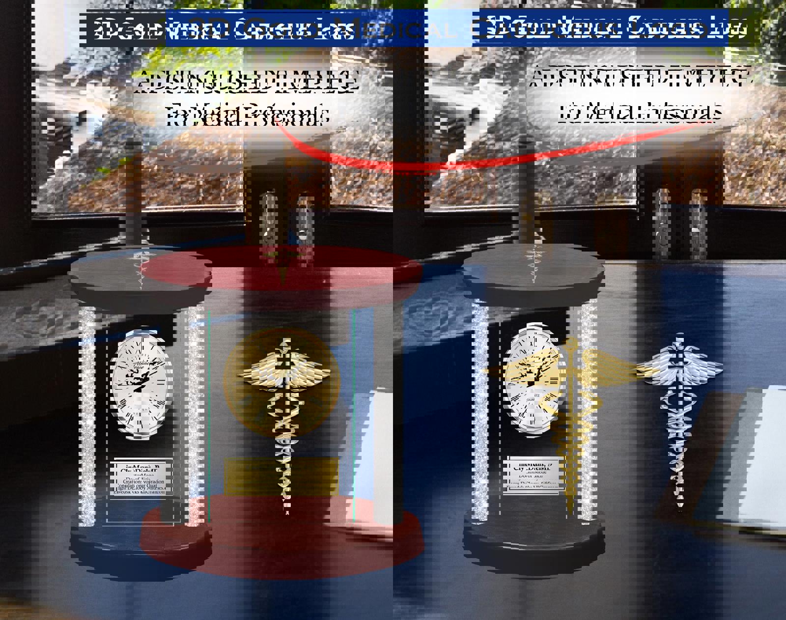 The subtle adorning doctor, physician or nurse engraved desk clock comes to life when given an elegant retirement, appreciation and service award gift. The personalized mantle clock compliments the traditions use of superior contemporary award trophy designs. A grand and impressive personalized diamond filled column desk clock, this exquisitely crafted doctor retirement, medical school graduation, physician birthday or registered nurse gift curates a unique design clock that convey modern-day elegance. Journey through time and space, encapsulated in the most luxurious combination of materials and designs with this beautiful etched table top diamond column desk clock with 3D gold medical caduceus logo. This dual column diamond column mantel table gold engraved clock collection is a unique congratulation medical residency. medical school graduation, years of service award and retirement gift. Elegant roman numerals, a second hand, and deluxe quartz movement with crystal clear glass panel encapsulated in the most luxurious and exclusive clock panel showered with hundreds of crystal clear acrylic diamonds filled in each pillars of the desk clock. Crafted by skilled engraved clock artisans, mottled hues of colorant cherry wood finishes and gold engraving plaque are applied to achieve a time-endured elegance, adding recognition sophistication to any college university medical school graduate.