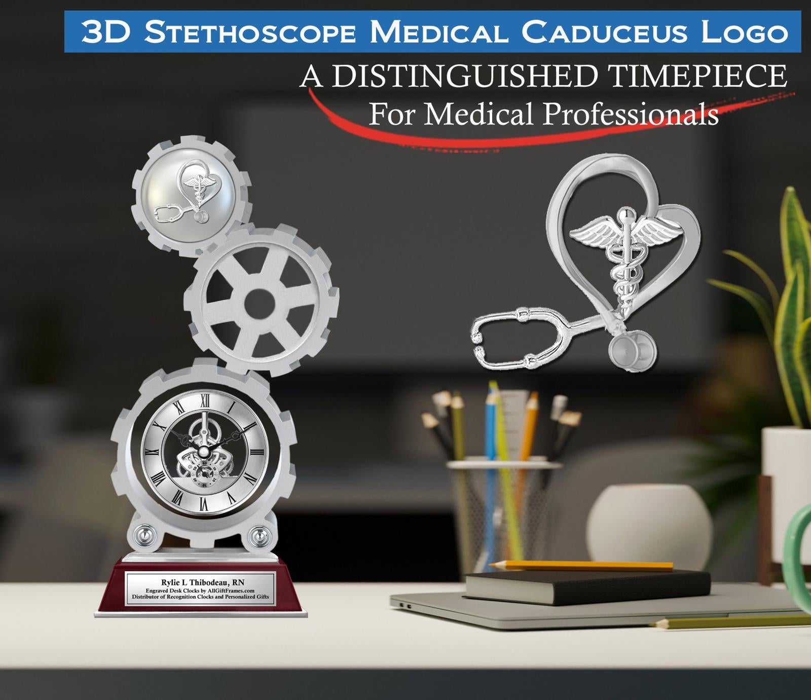 A truly inspiring congratulation and achievement award engraved clock gift, triple towering gear shape designs with its solid and heavy silver aluminum gear monument take the shape of a remarkable nursing school graduation or nurse service award gift for registered nurse, bachelor of science in nursing graduate, doctor of nursing practice, physician associate or nurse practitioner. Coworker, boss or colleague employee service award and appreciation is elevated to a new level with this table desk mantel clock timepiece with chrome silver 3D stethoscope medical caduceus for office or home decor medical professional.