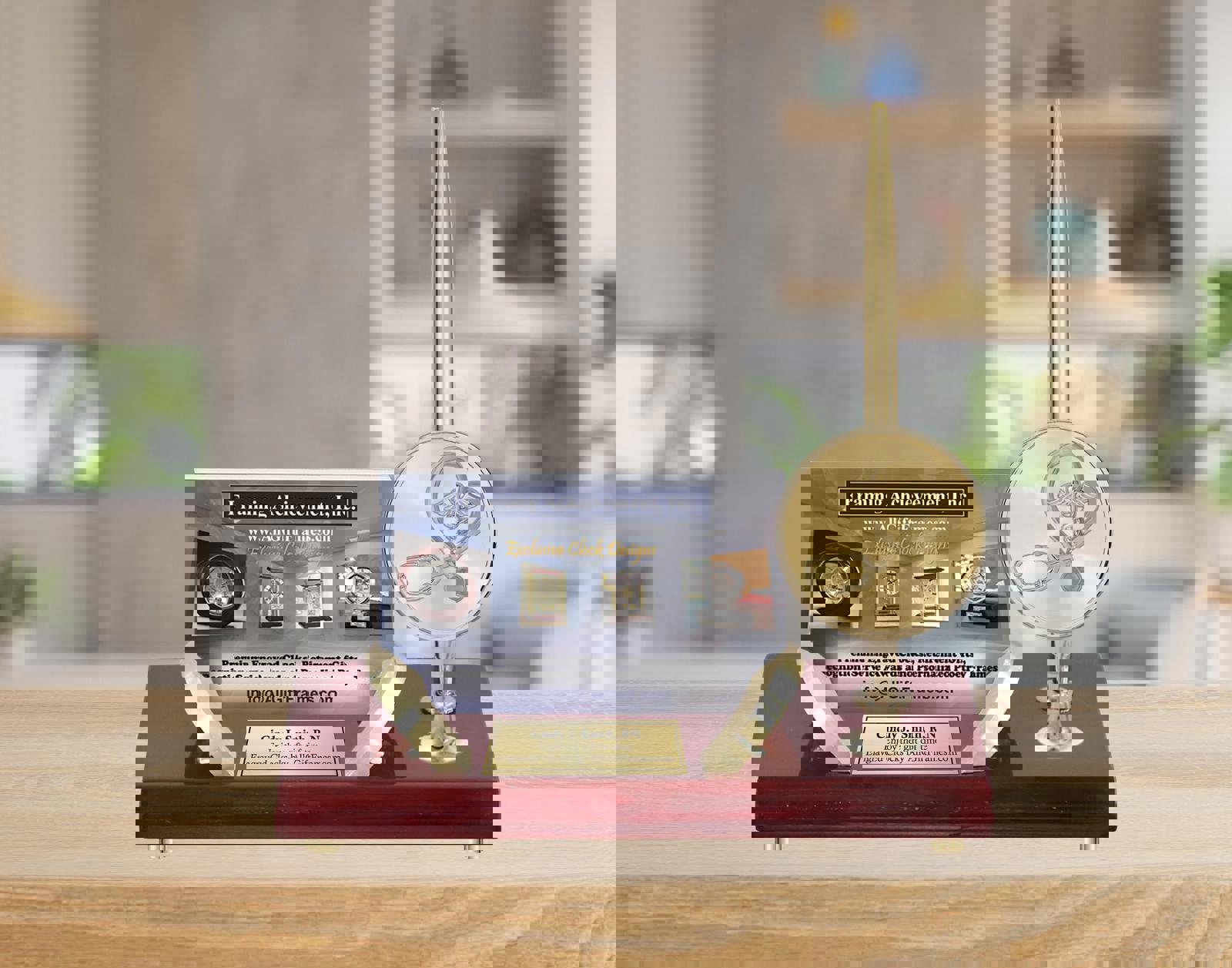 Showcase their title and display professional business cards on the elegant gold metal accent holder. The personalized engraved nameplate corporate service award gift will be a timeless employee coworker keepsake that will be treasured.