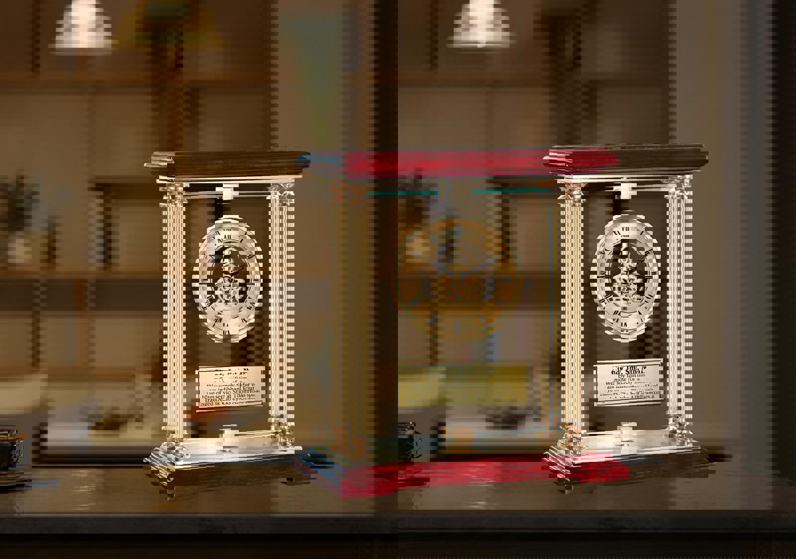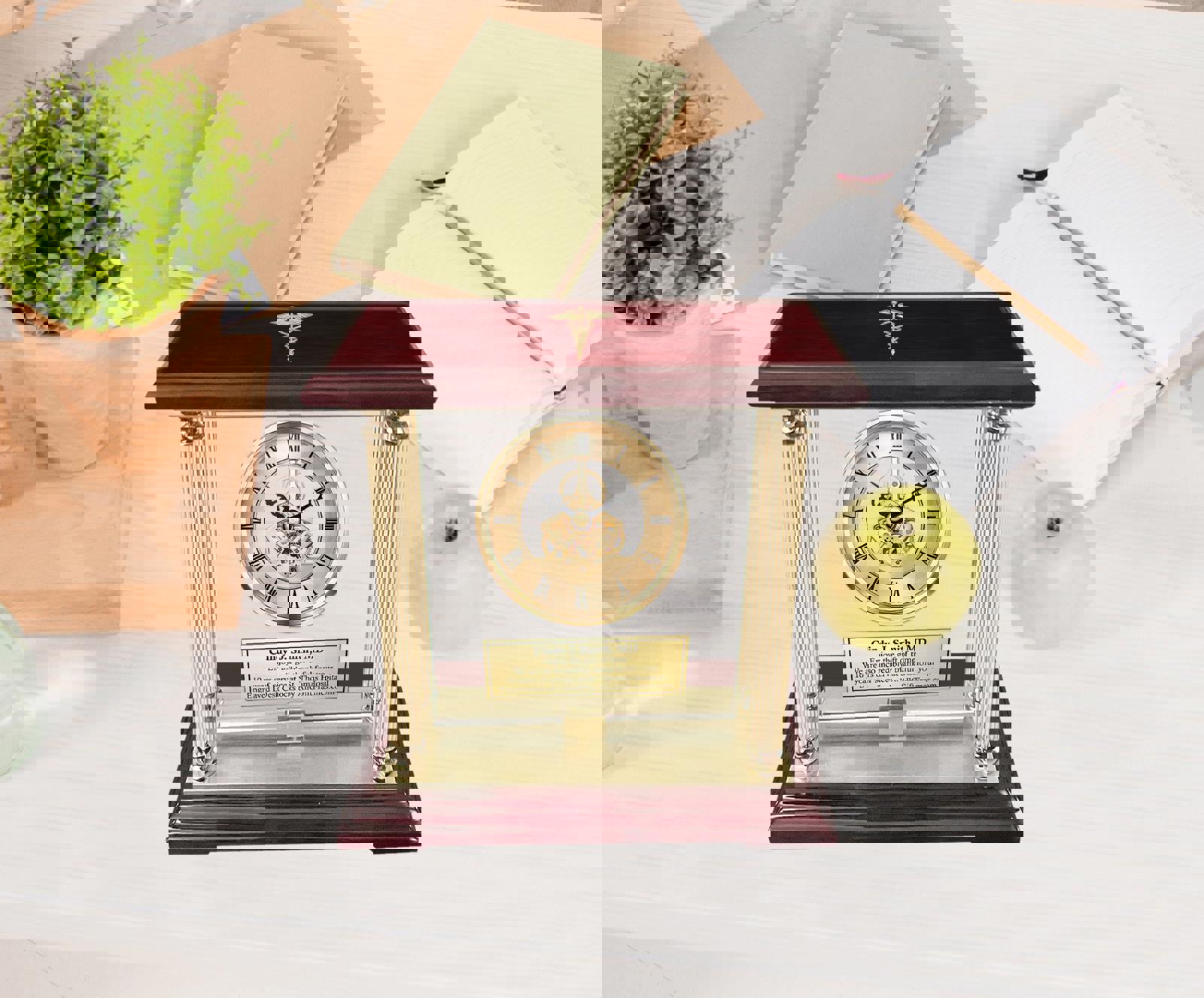 The rotating desk clock, with pristine cherry wood and metal gold accents, features a beautiful, elegant roman numerals with ornamental hour and minute time movement needle on DaVinci moving gear clock. Remarkable beautiful congratulation doctor clock awards are created with a personalized engraved thank you appreciation recognition plaque mounted on glistening crystal clear glass panel. This skillfully sculpted rounded top cherry wood design personalized gear clock brings to new heights. Whether displayed in an medical office or home, the encore adds elegance to any decor. The gold engraved plaque is skillfully crafted into piercing images setting a lofty theme. A gift of time to show appreciation and thank you gift for the Registered Nurse or Doctor of Osteopathic Medicine recipient.