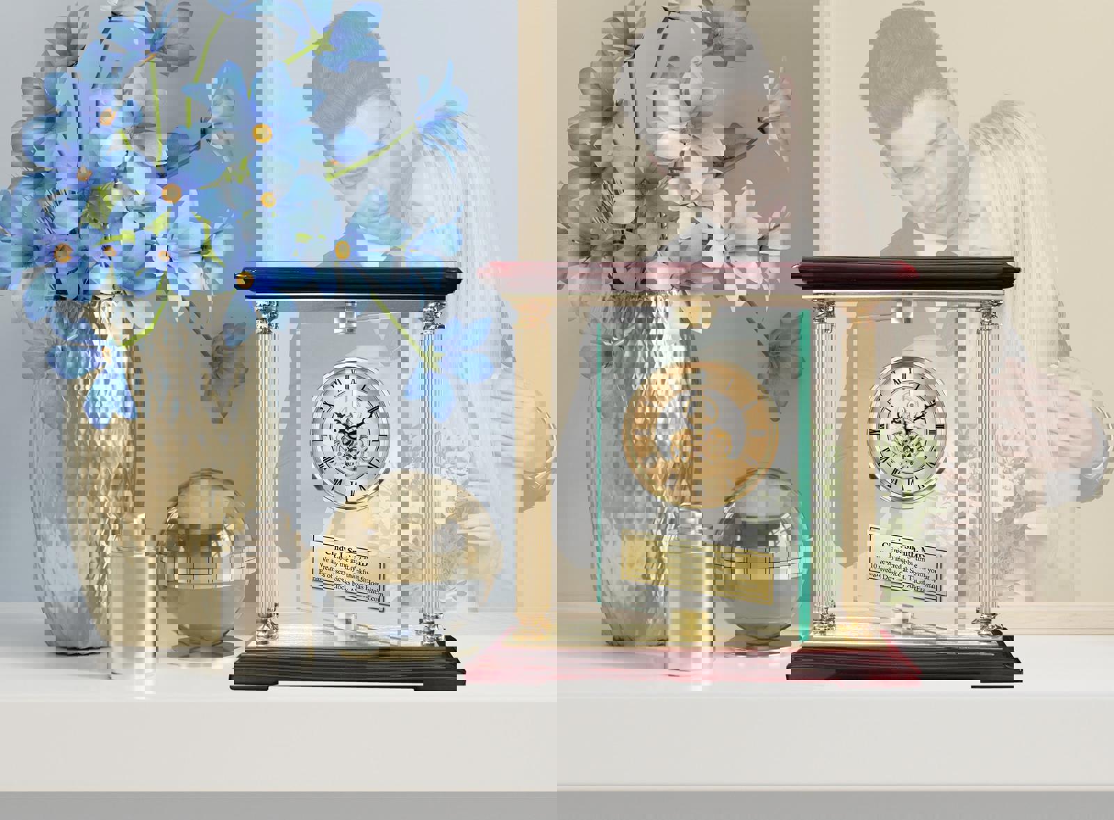 ♥ Premium laser engraved quartz movement clock embedded in manual swiveling 360 degree glass panel