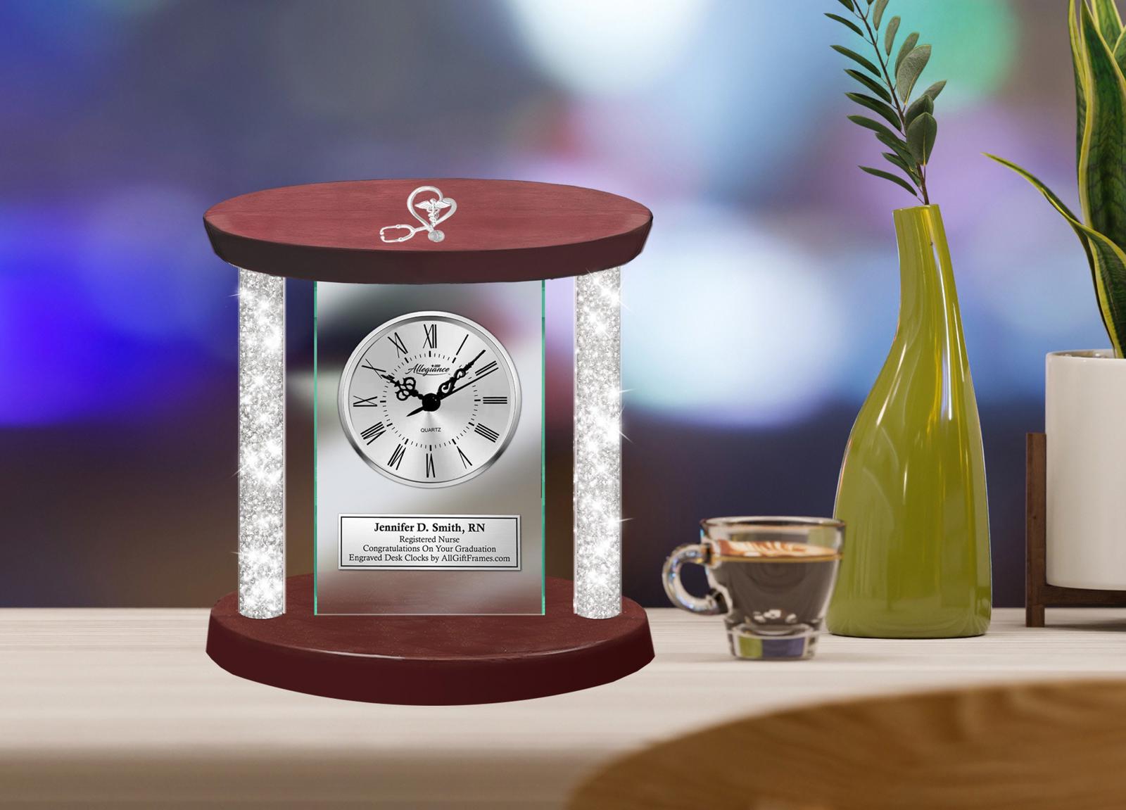 Elegant roman numerals, a second hand, and deluxe quartz movement gold nursing emblem clock with crystal clear glass panel encapsulated in the most luxurious and exclusive clock panel showered with hundreds of crystal clear acrylic diamonds filled in each pillars of the desk clock. The silver table decorative modern clock has a beautiful wooden shiny finished and luster protective coating to achieve a time-endured elegance. A grand and impressive personalized diamond filled column desk clock.