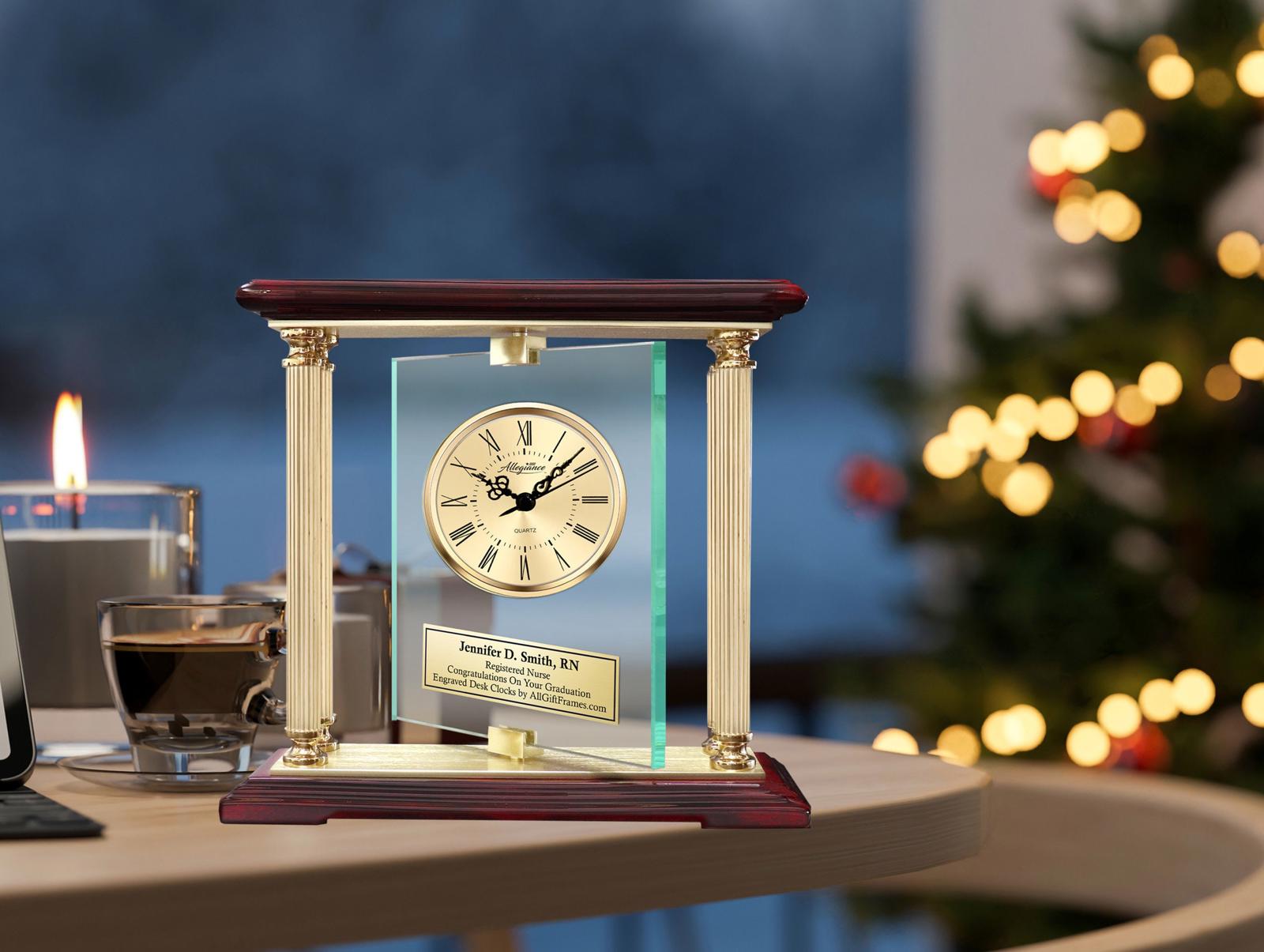 The manual spinning sculpted congratulation thank you nurse retirement engraved clock forms a appealing achievement billboard by combining four metal columns, beveled crystal glass with solid cherry wood top and base.