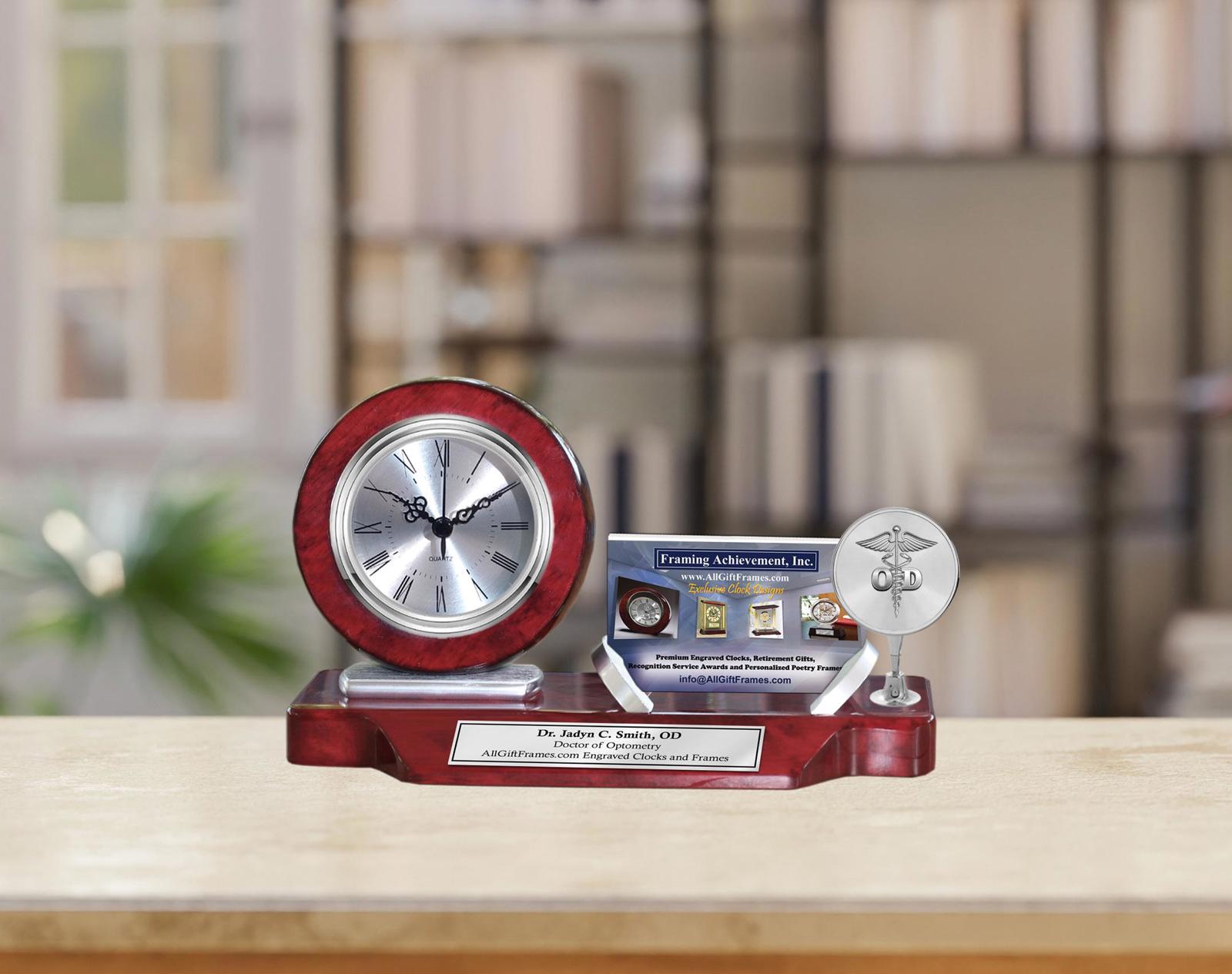 Smooth rich cherry wood base compliments the brush silver metal business card case stand holder with 3D silver chrome doctor of optometry OD logo for optometrist and optometry school graduates. Unique optometry university graduation gift or appreciation years of service award for employee, coworker, boss and colleague. A customized etched wooden base business card stand desk clock display will make a unique optometry school college graduation gift, medical employee recognition years of service award, and eye doctor retirement gift. The charming desktop accent silver table desk clock and office corporate business card holder is a great mementos for optometrist employees and optometry student graduate.