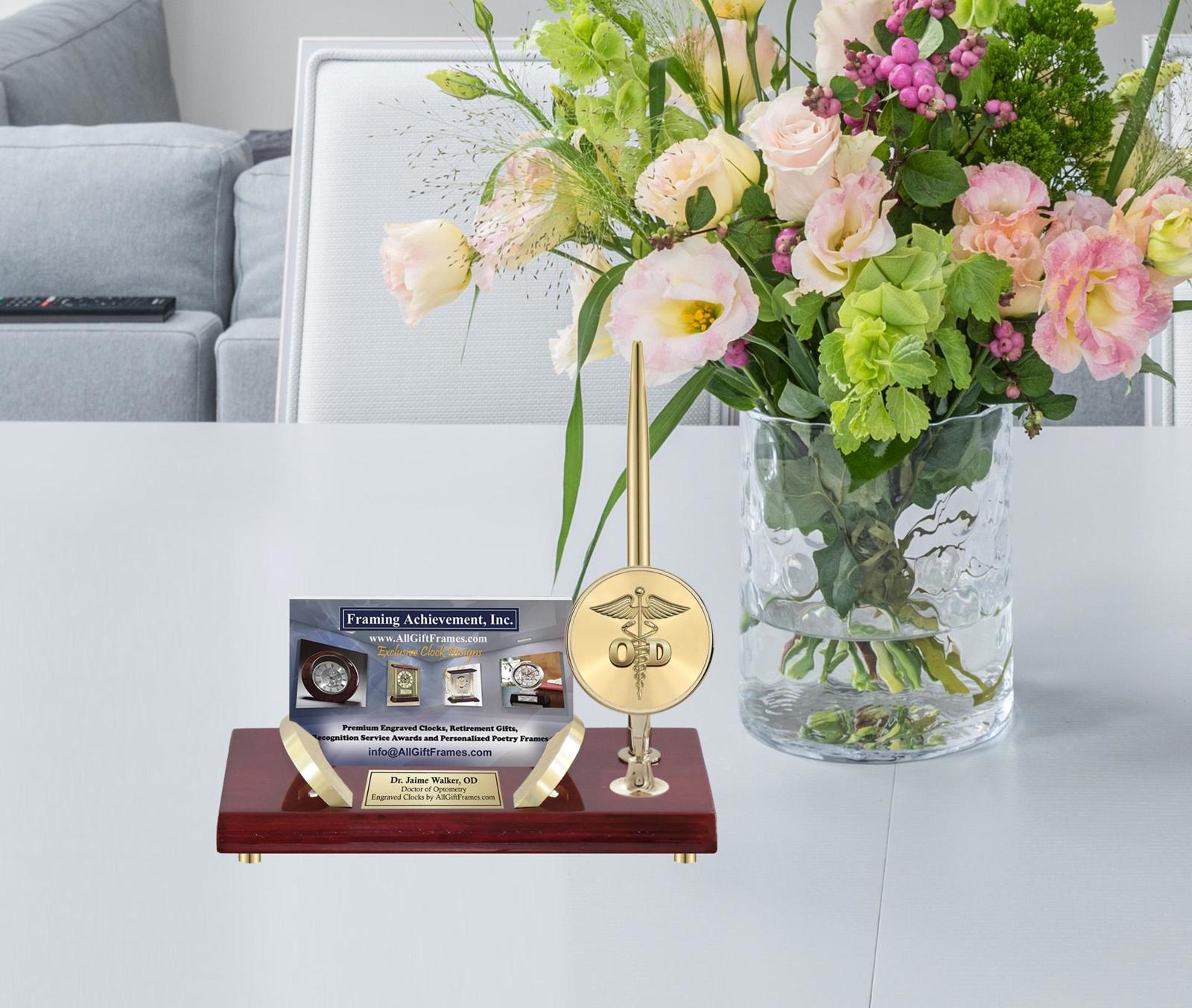 The personalized engraved name plate single gold pen service award gift will be a timeless employee keepsake that will be treasured by optometrist. Reward optometrist employee or doctor of optometry with a desk business card holder, pen and OD optometrist logo as a unique corporate gift idea, years of service award or school graduation gift. Display the graduate title and display professional business cards on the elegant gold metal accent holder with 3D gold optometry logo.