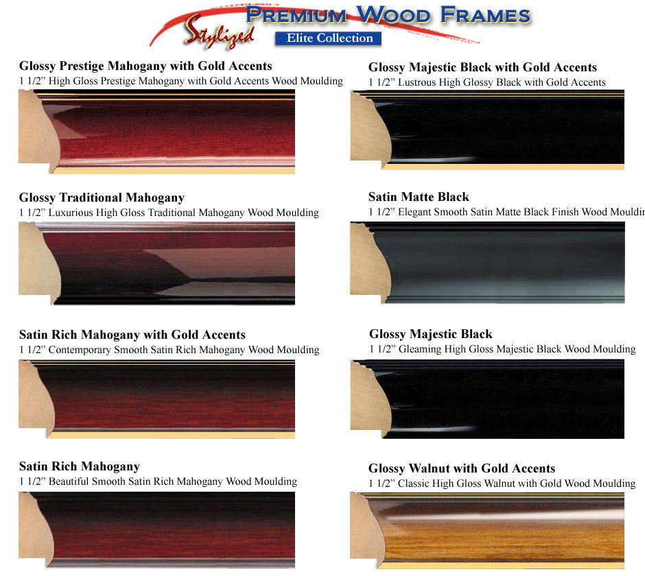 The difference between a glossy and a satin rich frame is that the glossy finish diploma frame wood moulding is really shiny while the satin rich frame has a luster matte finish. We offer 8 high quality premium wood graduation picture portrait frames and many mat combinations to choose from, so your personalized college photo frame design possibilities are unlimited. You can mix and match matting colors, college major logo medallions, gold embossing or engraving plate personalization and styles to create a beautiful college tassel frame or professional certificate frame design that suits your taste. Our wood graduation tassle diploma frames are custom made and developed at our facility in California, USA.