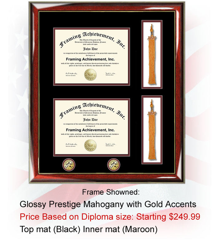 Shop college tassel diploma frames and certificate plaques with graduation tassel at our diploma framing manufacturing store. Our collegiate tassel holder double degree frames are unique graduation gifts for university and high school graduates that have two certificates or graduation tassels. Build your double dual diploma frame with tassel holder opening and professional college major logos at AllGiftFrames.com. You will the best selling personalized college graduation diploma tassel frame and graduation picture frame gifts with personalization at Framing Achievement Product: FA61 -. To order, simply follow the shopping cart steps 1, 2, 3 etc... below and design your beautiful personalized double diploma frame.