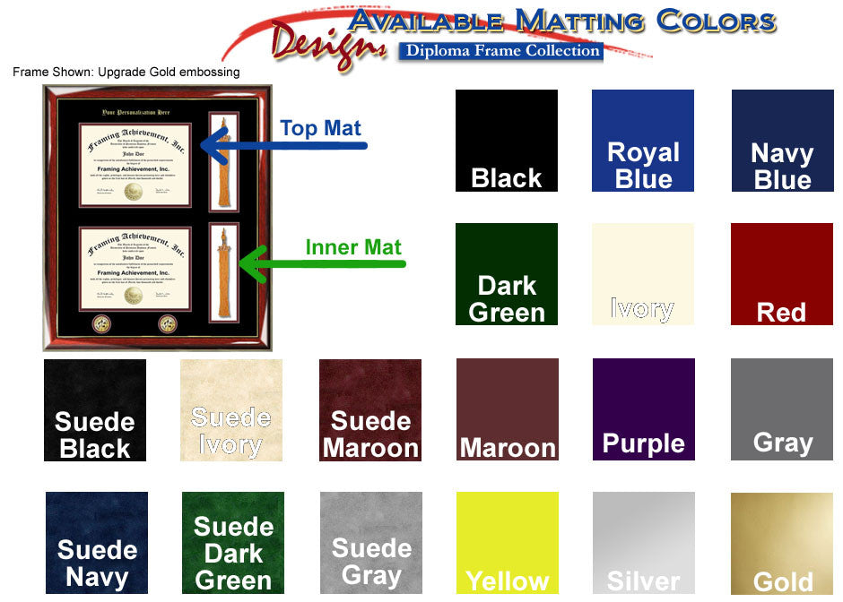 Elegance, Admiration and Exceptional, AllGiftFrames.com sells several designs of double diploma frame matting colors. Intensify your double degrees with double-matting colors to match the wall of your home or office. We use pH balance mat boards that help preserve and protect your diplomas. This dual frame includes choice of Top matting color with optional Inner mat upgrade. When upgrade, the Inner mat color, the inner mat border highlights the dimensional detailing of your awe-inspiring diploma in the double certificate frame. Beautifully show your academic graduation success with our double degree diploma frame with college graduation tassel. University or high school graduates can show off the concept of sophistication and style in their office or home decor with an elegant gold emboss college double diploma frame with professional seal.
