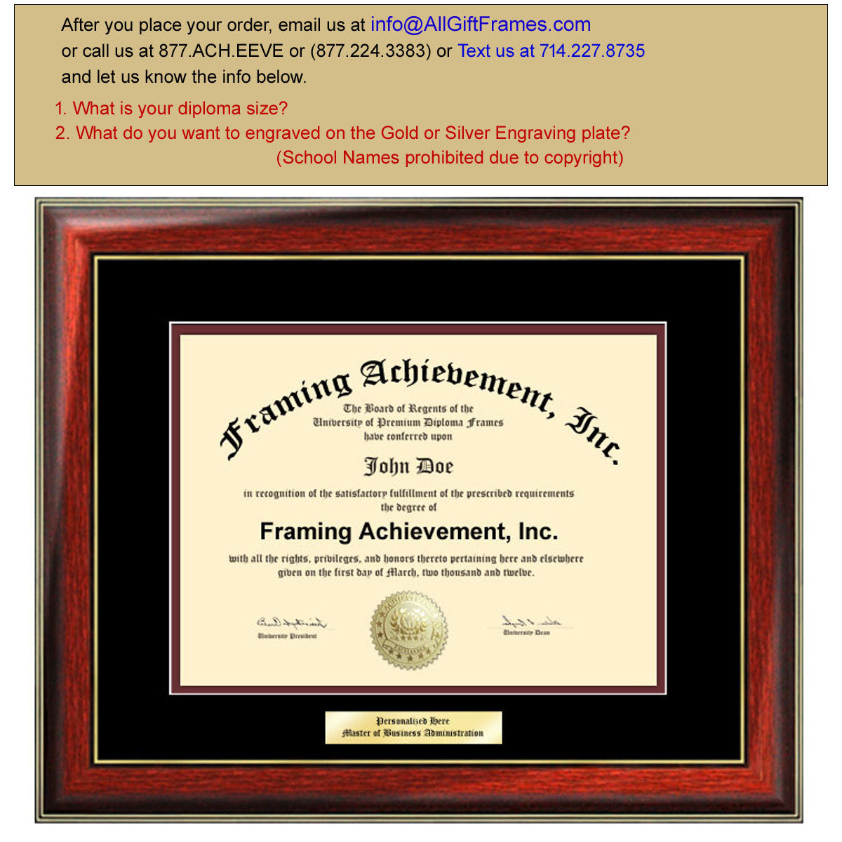 Personalization Examples on Diploma Frames