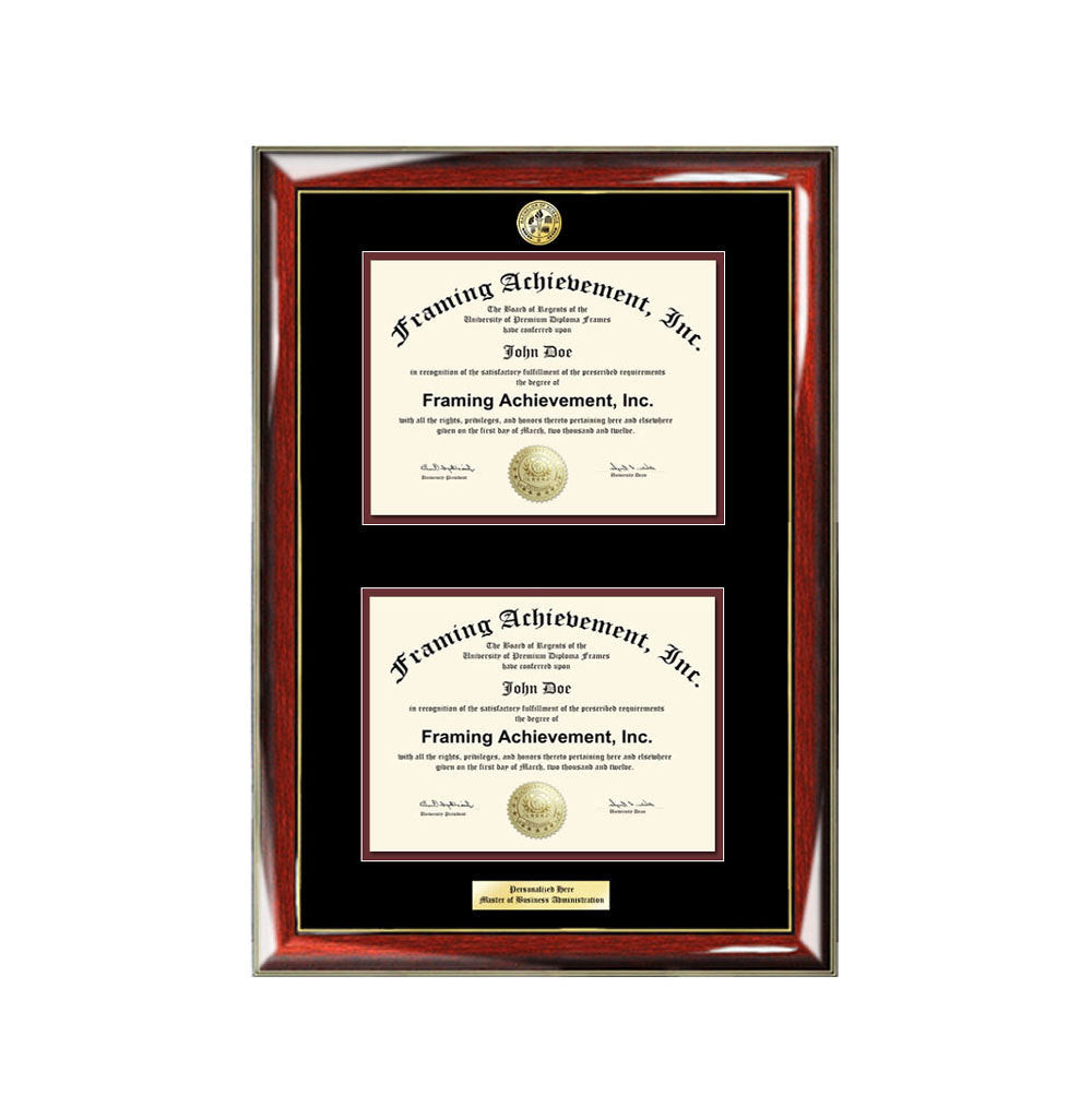 Graduation Dual Degree Diploma Frame Engraved University Major Logo Glossy Prestige Mahogany Gold Accents Top mat Black Inner matted Maroon
