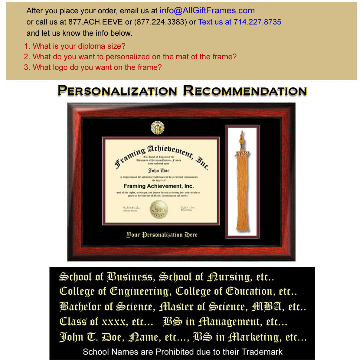 Gold Embossing of Personalization Examples on Diploma Frames