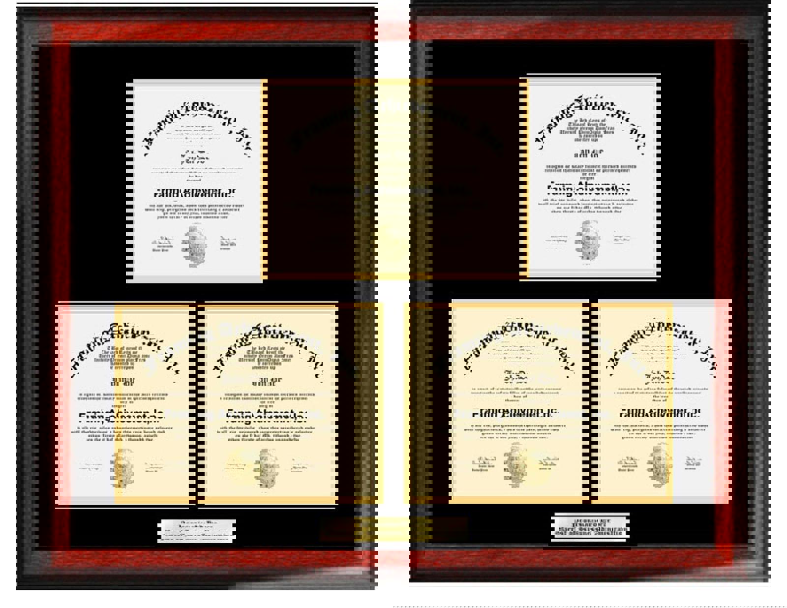 When combined, the dual diploma case frame will bring back distinction and academic success that will never be forgotten. Let AllGiftFrames custom certificate award custom dual document frames recognize and preserve your graduate's success for many more years to come. Commemorate your two university major diplomas with a premium double diploma frame with college major degree logos and personalized gold embossing on the degree mat. We also know that it takes cleverly designed graduation custom frames and nifty elegant wood mouldings to connect with our customers needs to show off their achievements. Frame your Bachelor's, Master's, MBA, state board certifications, licenses or PhD Doctorate degree in our deluxe dual custom frames. Share the joy of giving and expressing your recognition to your college, university or professional graduate by giving a unique dual diploma holder frame.