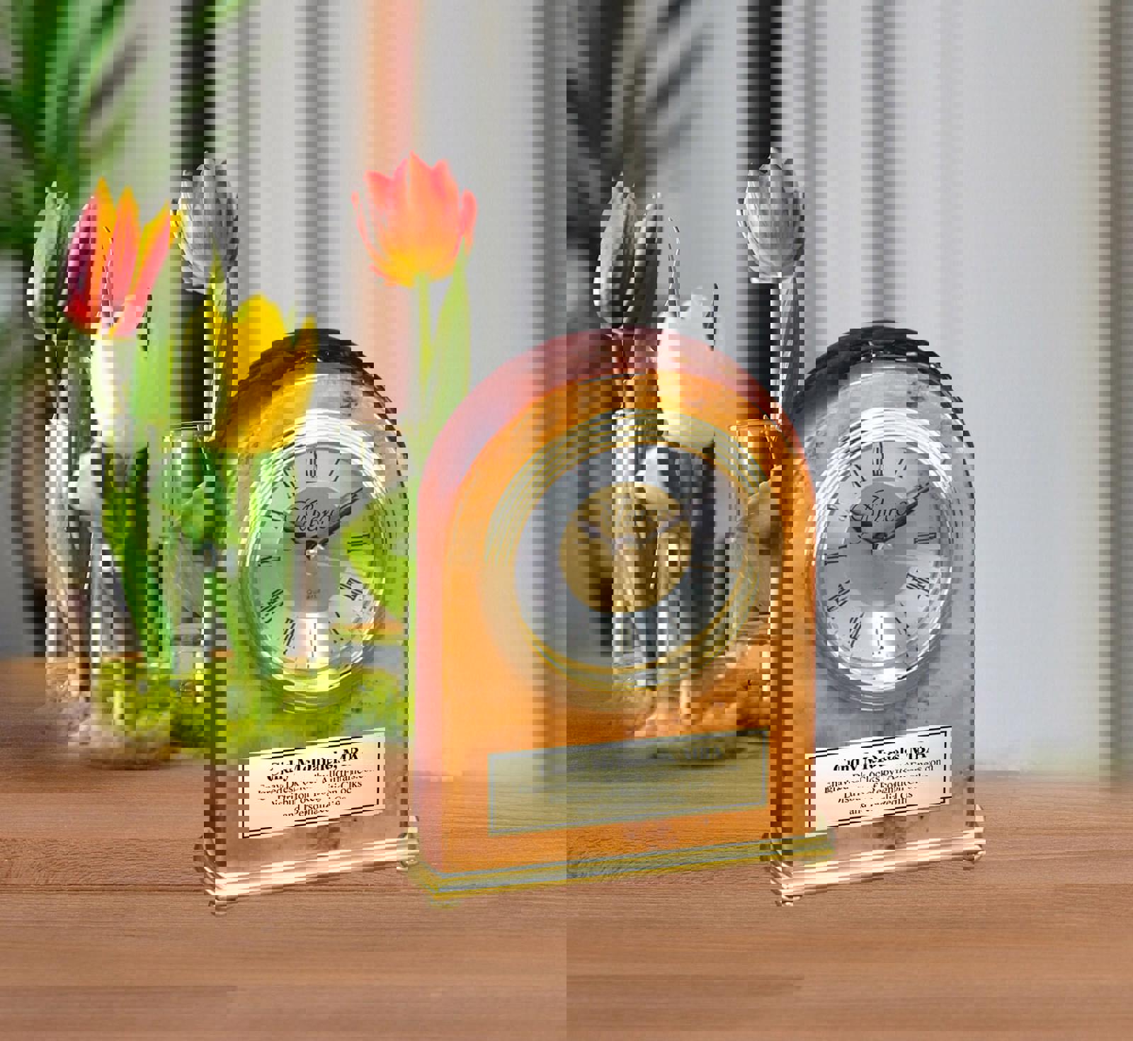 ♥ The gnarled appearance of the knotty veneer wood lends a rich warm look to this personalized tabletop clock mounted on gold metal accent base and engraved personalized plate