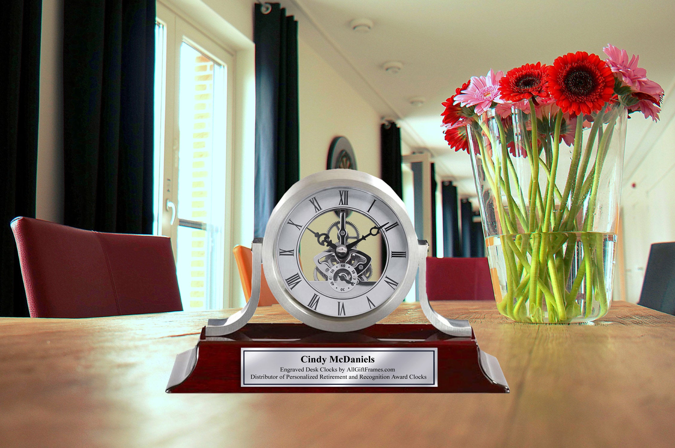 Personalized wood desk clock with silver engraving plate. Congratulation engraved desk clock with distinction. This beautiful engrave desk clock makes a unique retirement, employee recognition, wedding, anniversary or graduation gift present. A unique table desk clock gift idea for coworker, employee, boss, girlfriend, boyfriend, wife, husband, etc.... Personalized clock gifts by Framing Achievement, Inc. creation. Rating high on style and elegance, Framing Achievement's personalized clock gifts are the first choice in premium poetry presents for Anniversary, Birthdays, Weddings, Retirement, Graduation and many more occasions. Exclusive engraved retirement gifts and employee service award clocks. Source for Executive Recognition. We specialize in trophy clocks and custom design award clocks as employee recognition gifts and service awards. Let our personalized engraved desk clock gift products imagination wander and explore the possibilities that you can create with a custom sentimental meaningful message in our elegant clock gifts. Wood Mantel Clock Engraved Retirement Award Personalized Employee Gift. Simply offering desk clock awards, recognition trophies and personalized employee gifts