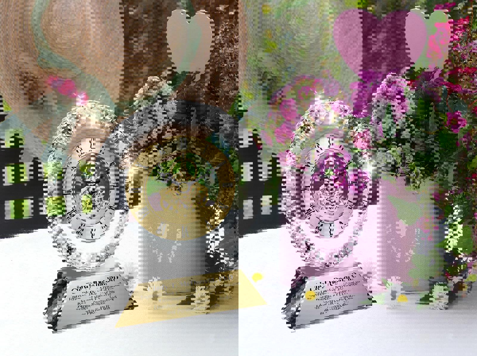 ♥ The brilliant faceted diamond cut casing with crystal pedestal holds a transparent gold mechanical gear clock that will let your words of love, congratulations, appreciation and recognition shine bright in a manner to inspire the colleague, boss, friend, retiree, coworker or college university graduate.