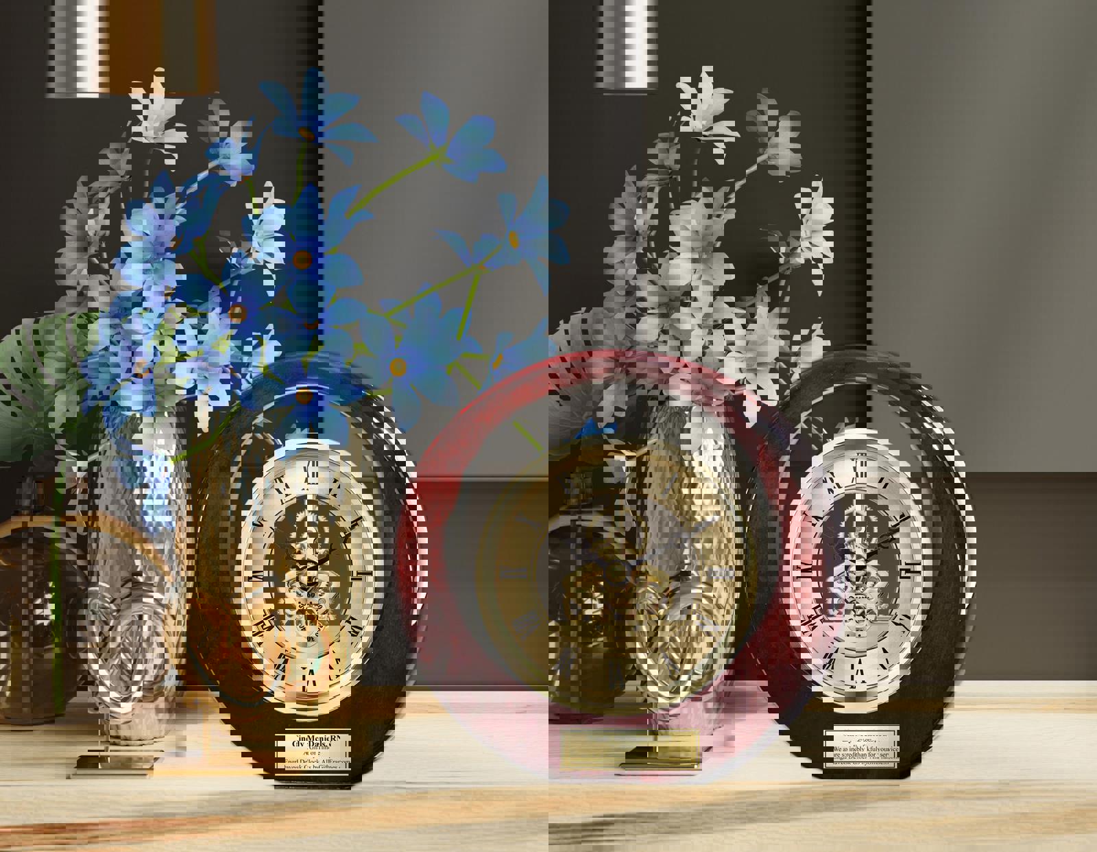 The personalized engraved plaque and elegant wood design work together to create a truly successful award as thank you gifts. Table desk mechanical clock symbolizes the importance of a solid foundation and creativity.