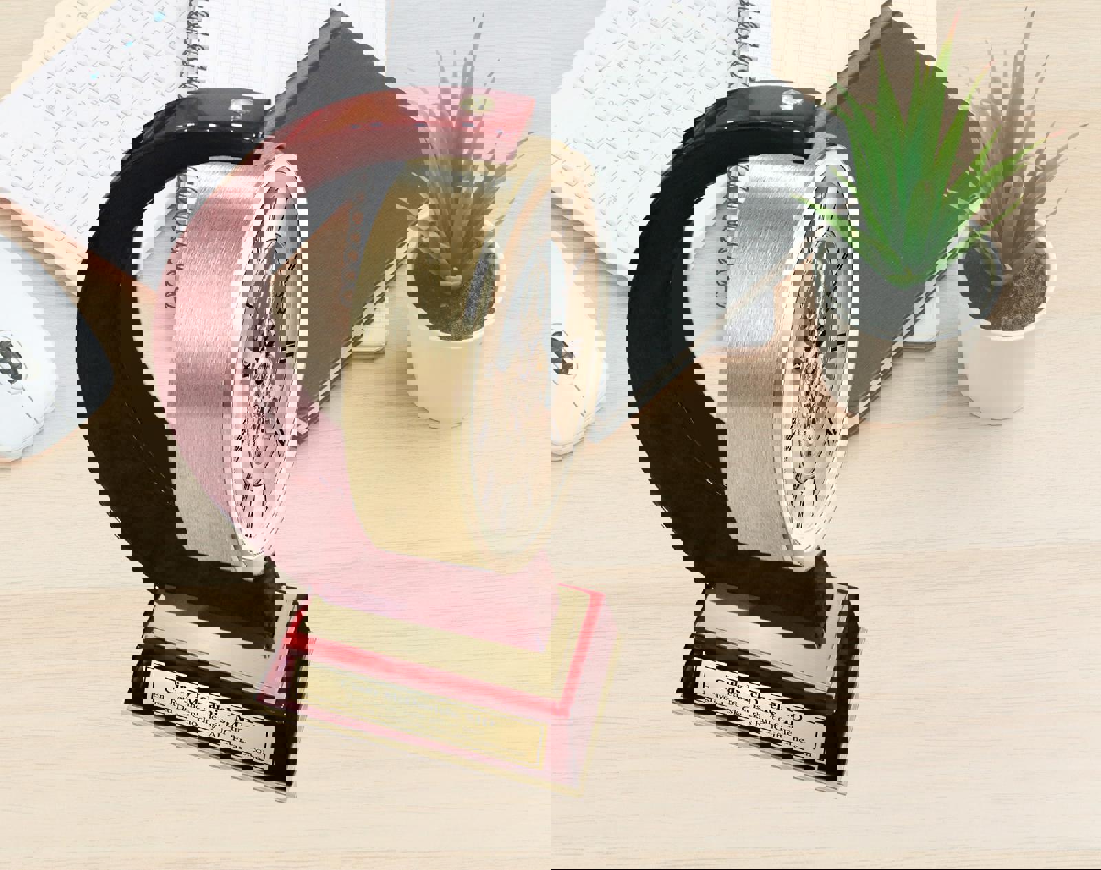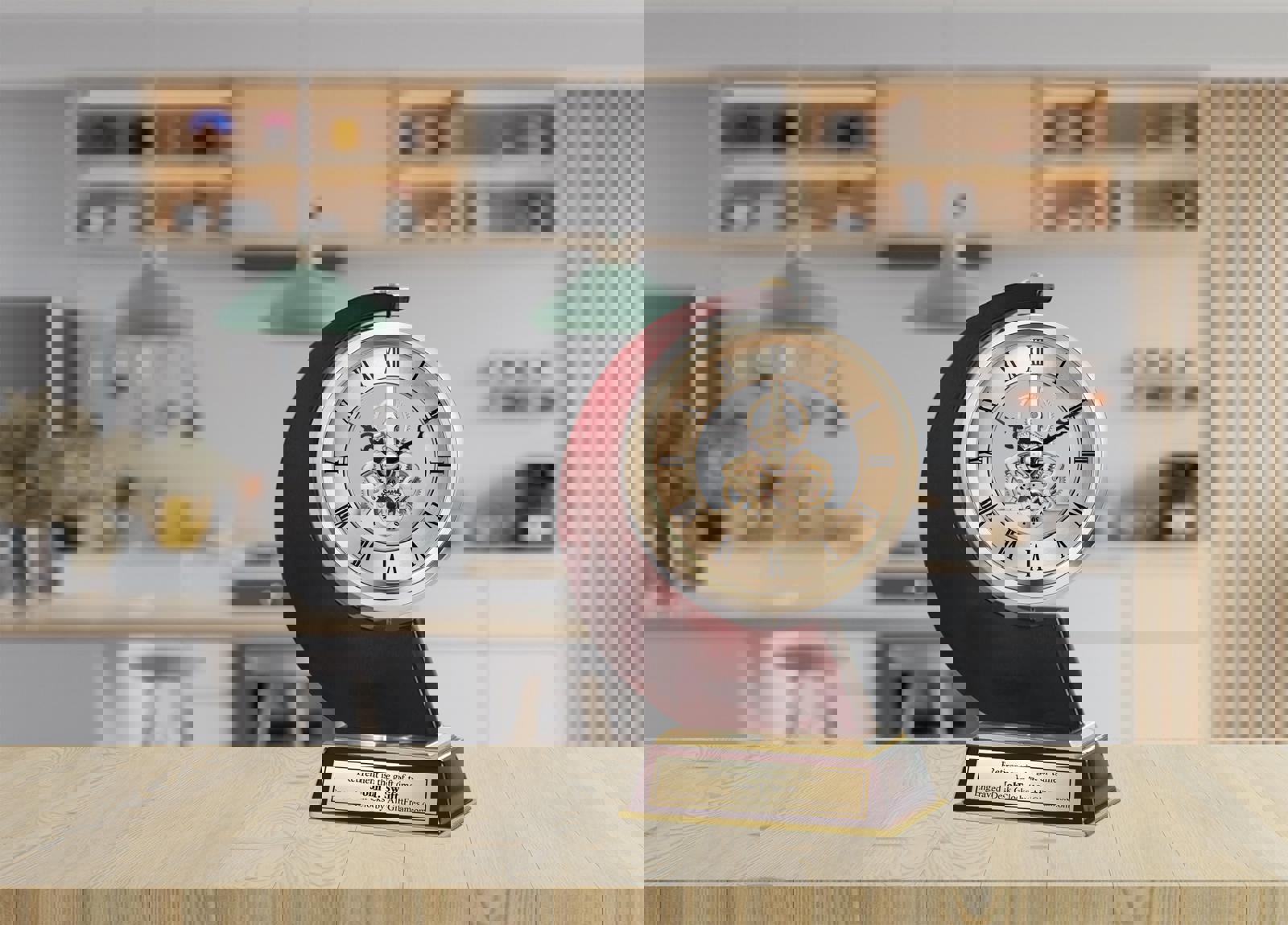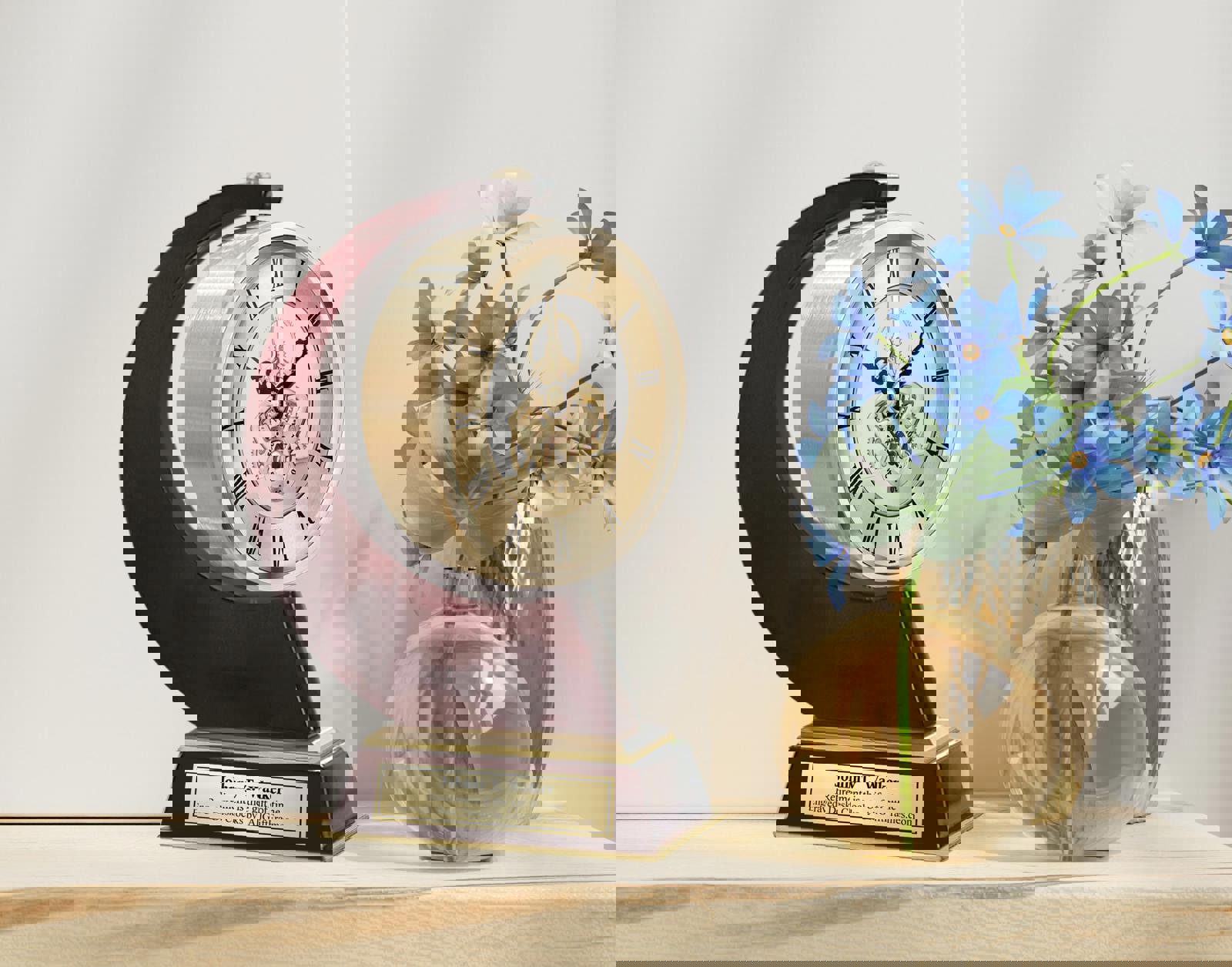 The personalized engraved clock that can manually pivot 360 degree creates added interest to this freestanding recognition trophy design. A gold engraving plaque gets a personalized retirement, appreciation or employee service award message out in a notable manner. DaVinci gold gear clock encase in metal brush casing graceful suspended on cherry wood arc. A layer of lacquered on cherry wood tops this sleek styled coworker birthday employee retirement service award or university graduation gift that epitomizes the look of success. An ample area for your etched and wedding anniversary personalized message sentiments has been incorporated into each of these sleek design clock years of service appreciation promotion award.