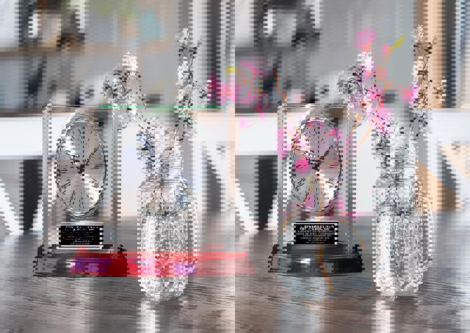 This compact in size yet elegant desk clock capture employee recognition with its memorable beauty. Overall engraved desk wood clock size approximately 6.5 x 6. This nice compact clock features brush silver face with designer ornamental hour and minute time movement needle embedded in glass on a lustrous cherry wood base. Elegant roman numerals complete its display. A handsome decoration for any office or home setting. Unique Elegant Glass Silver Clock Luster Silver Accents Black Engraved Plate Retire Coworker Wedding Gift Graduation Anniversary Housewarming Gift New Home Present. Efforts above and beyond the expected deserve to be rewarded in an appropriate manner. Whether a retirement gift or a recognition service award, this Marquee desk clock makes a splendid timepiece.